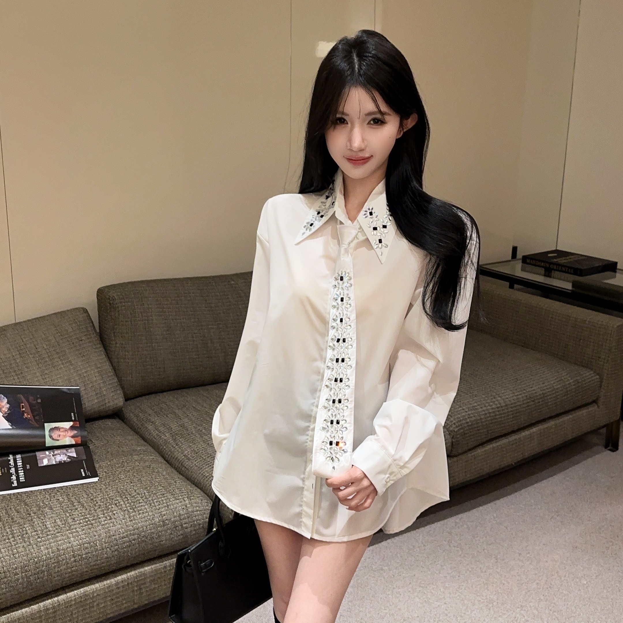 个性烫钻领带纯色宽松重工长袖上衣 服裝批發女裝批發服飾貨源