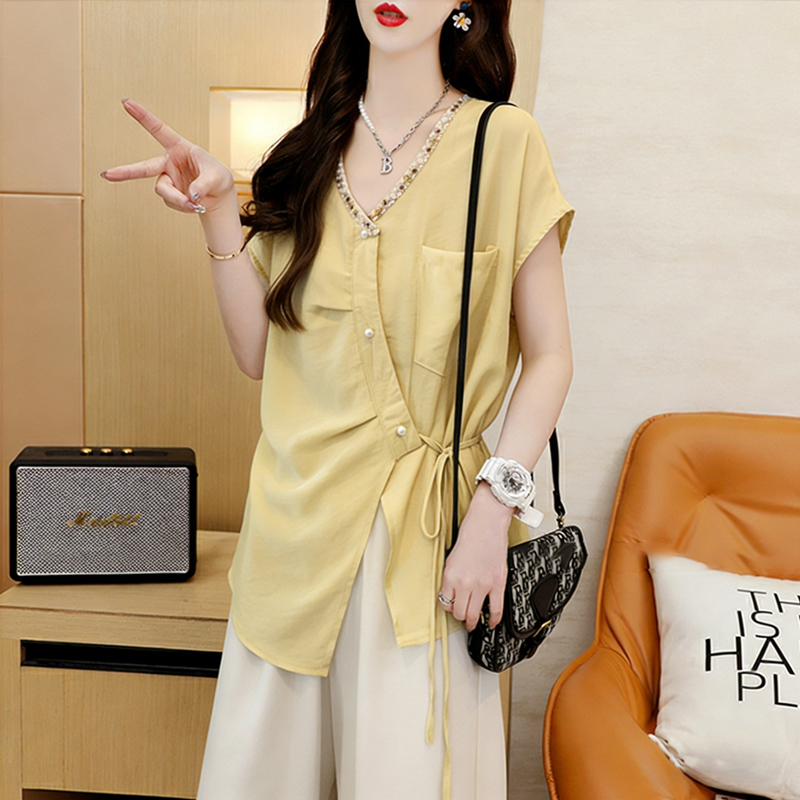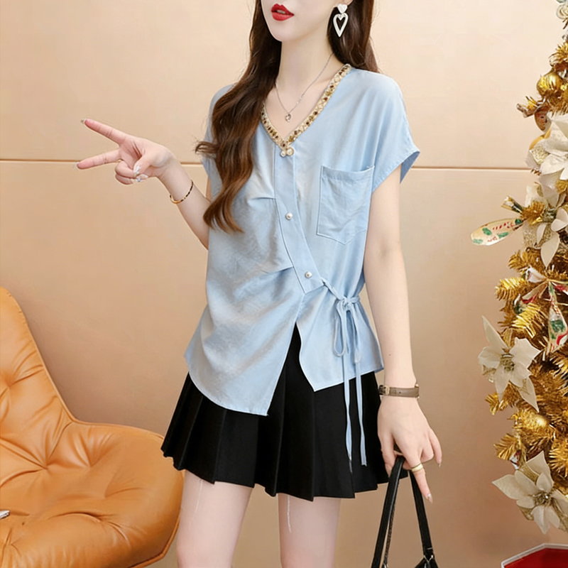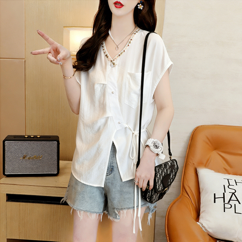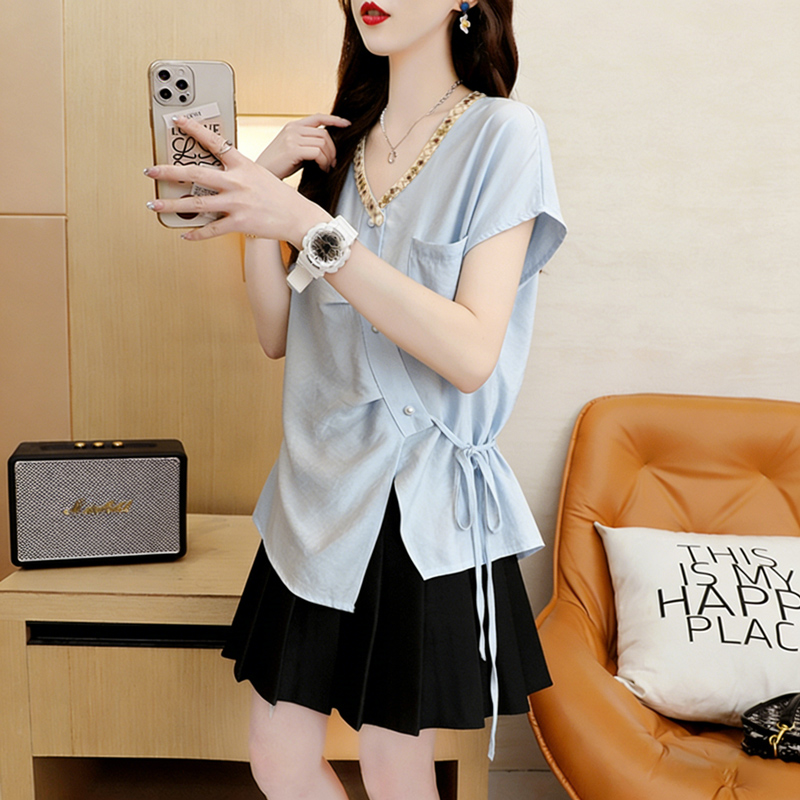 棉夏季薄款宽松系带不规则短袖衬衫女衬衣 服裝批發女裝批發服飾貨源