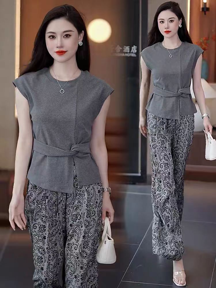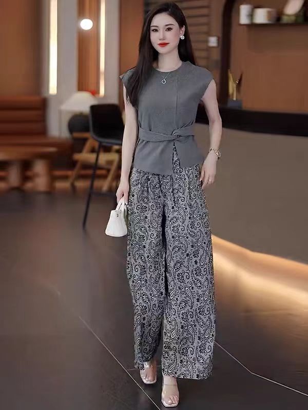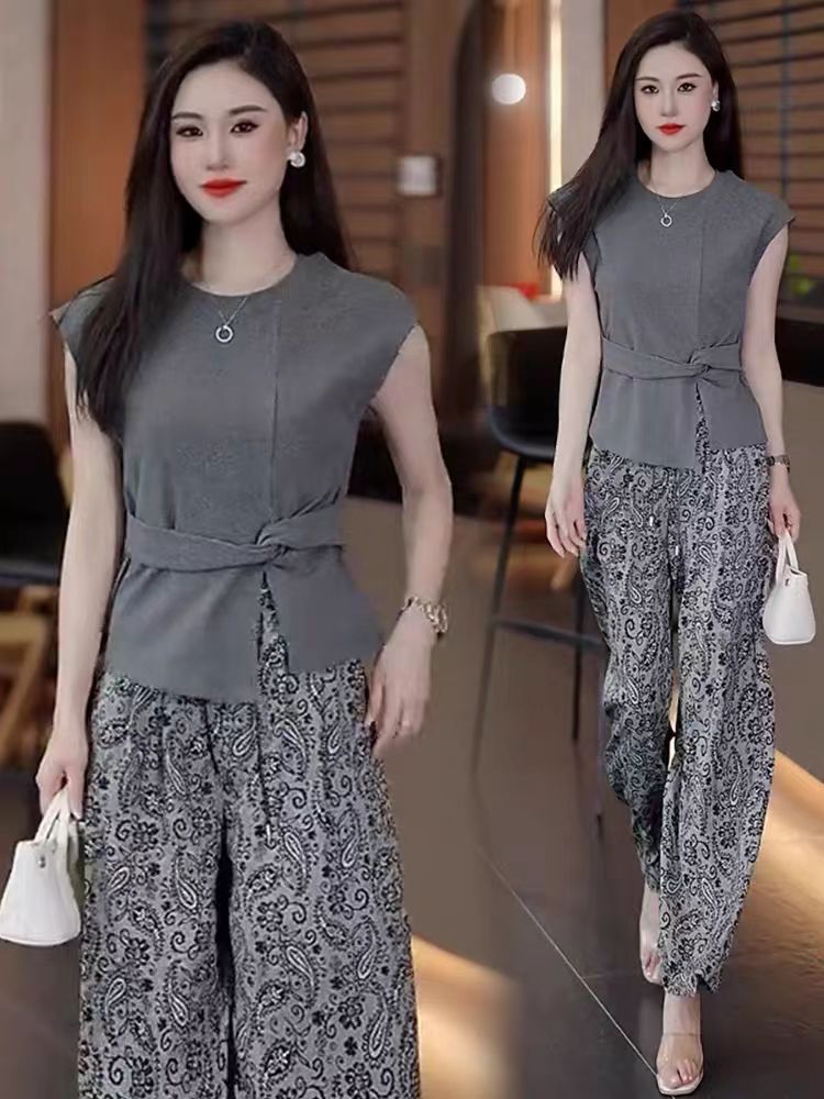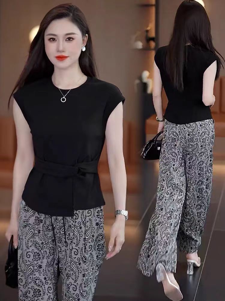 时尚套装女夏季新款洋气显瘦设计感短袖T恤印花阔腿裤两件套 服裝批發女裝批發服飾貨源