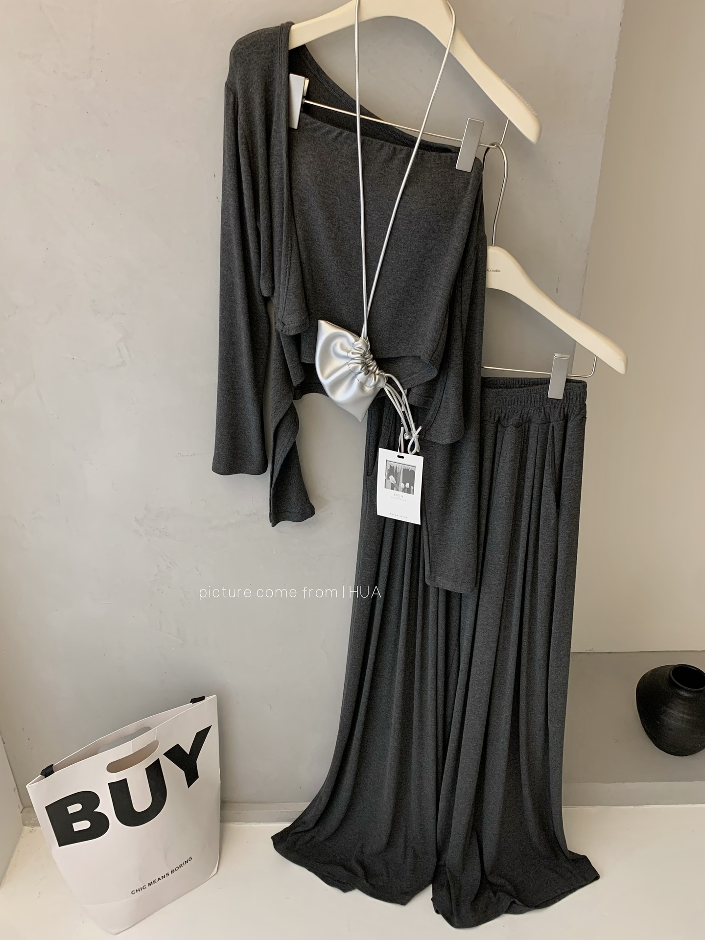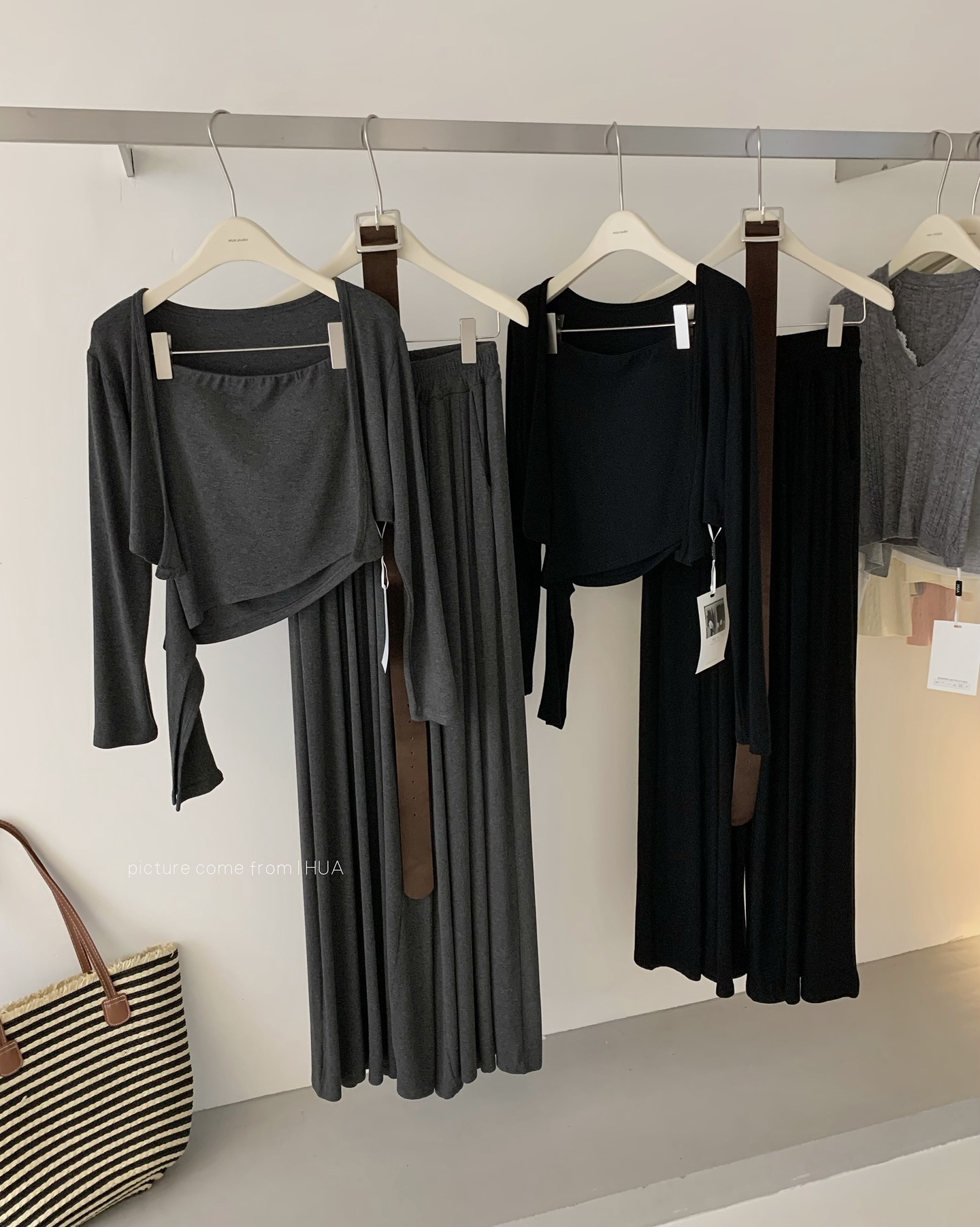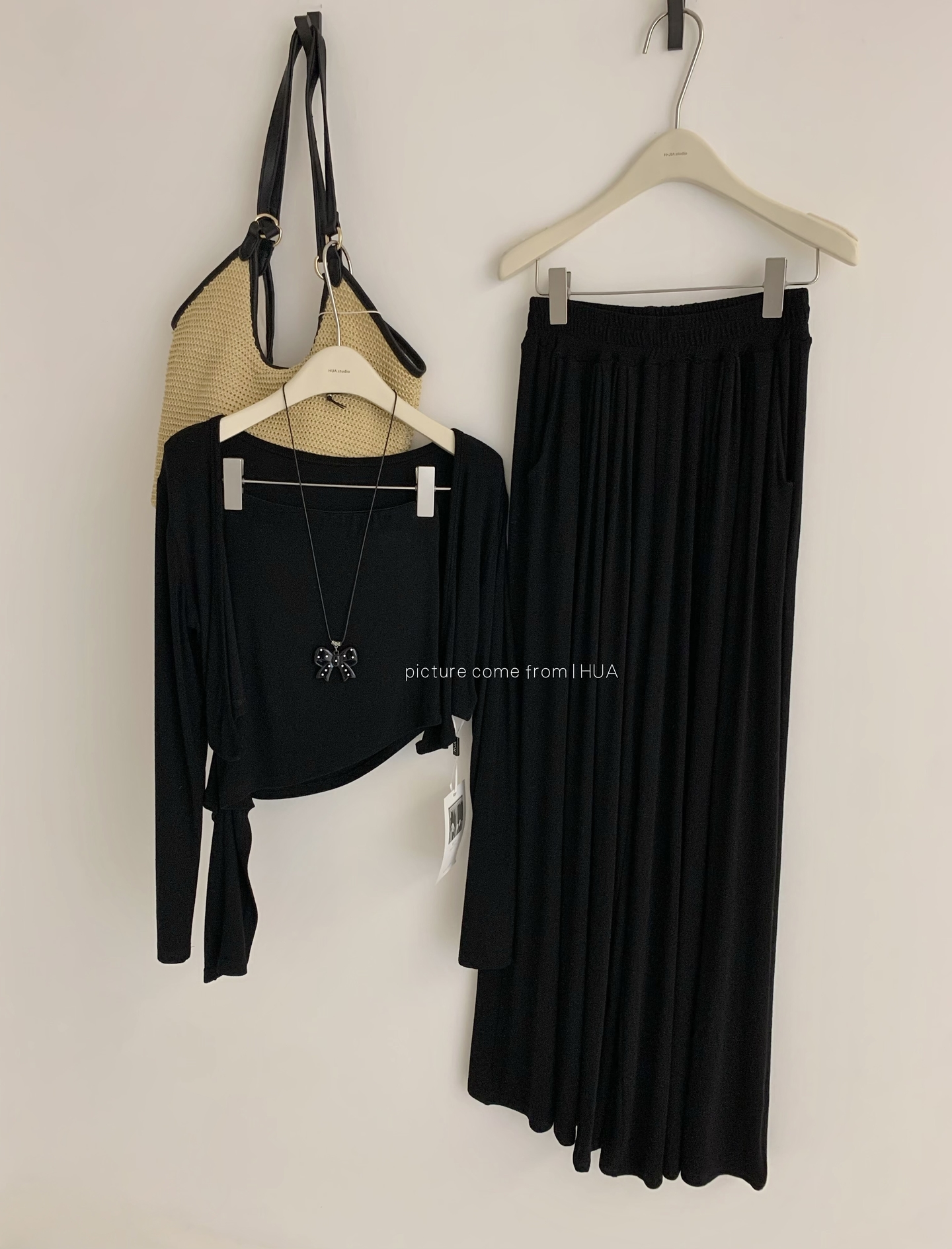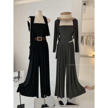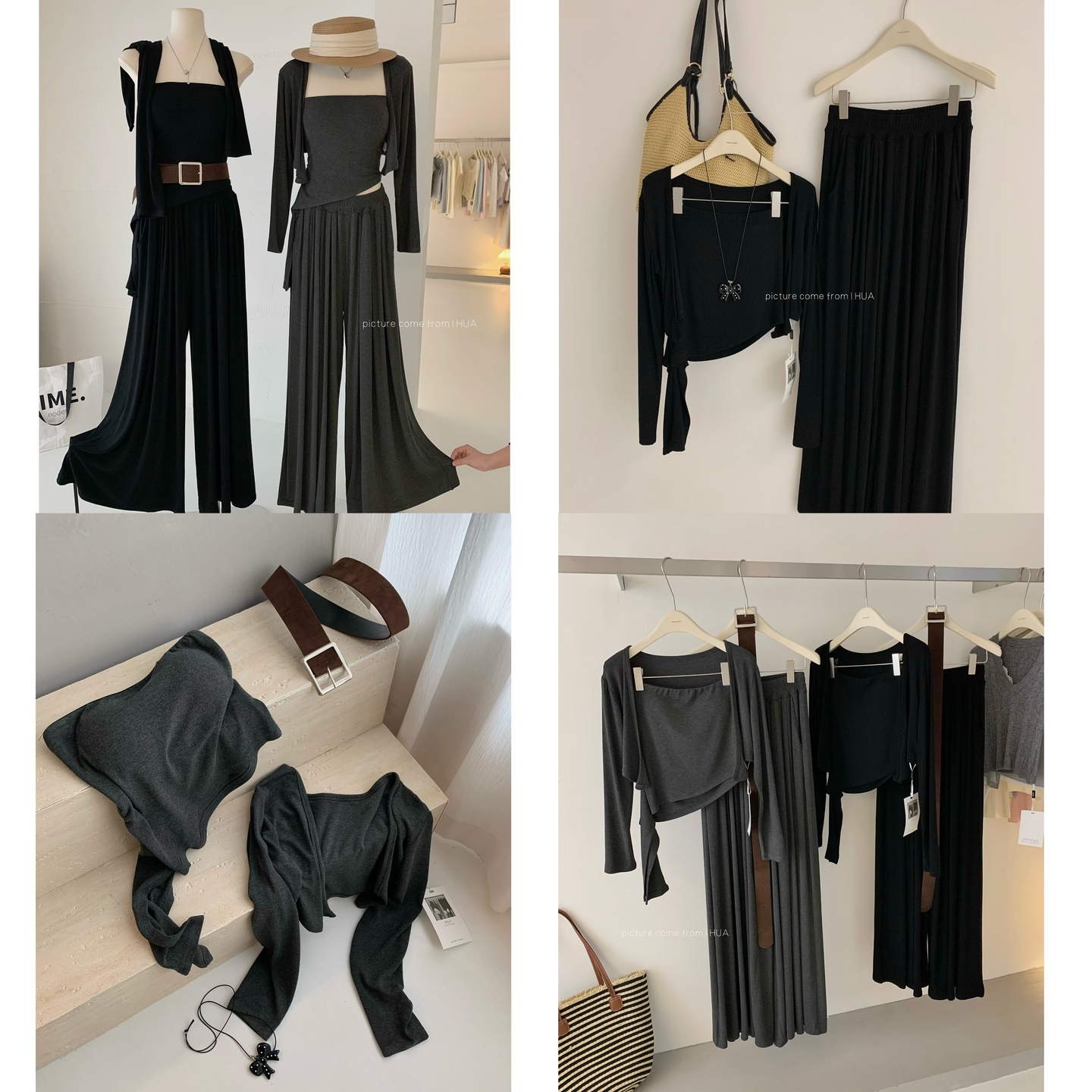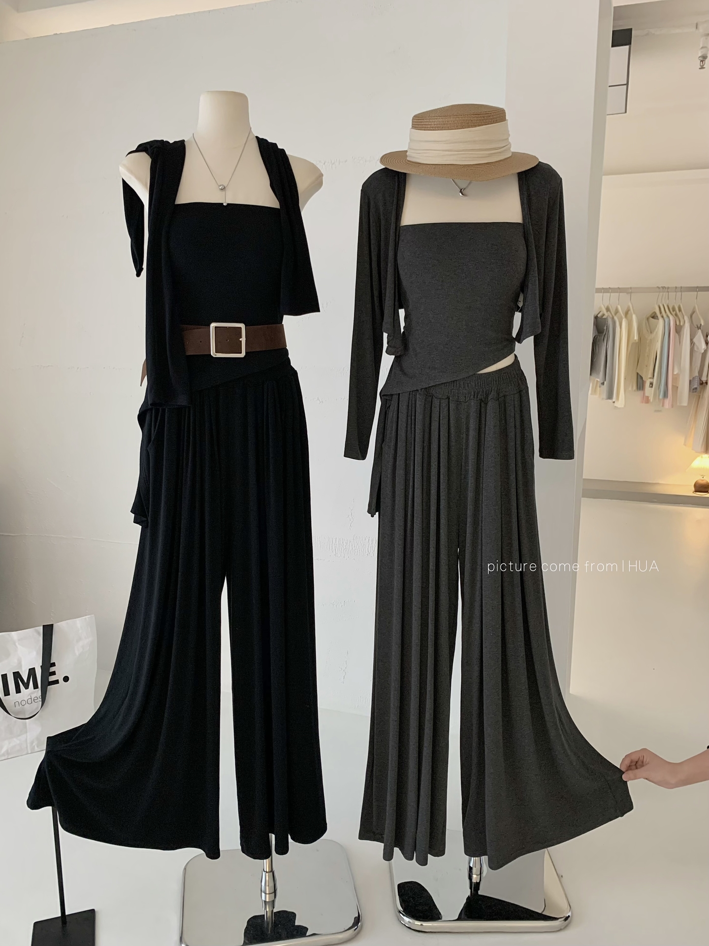 春季新款韩系设计感高级感针织开衫抹胸高腰阔腿裤时尚套装女 服裝批發女裝批發服飾貨源