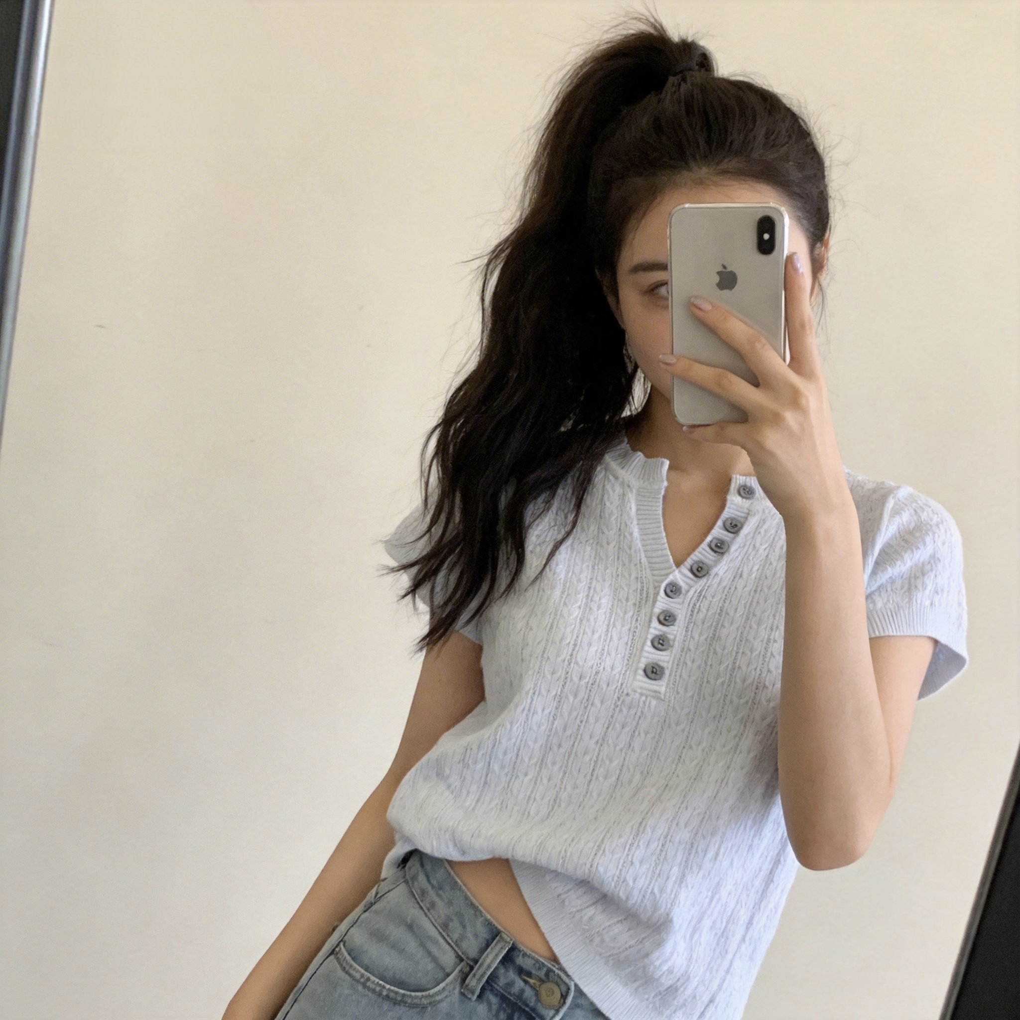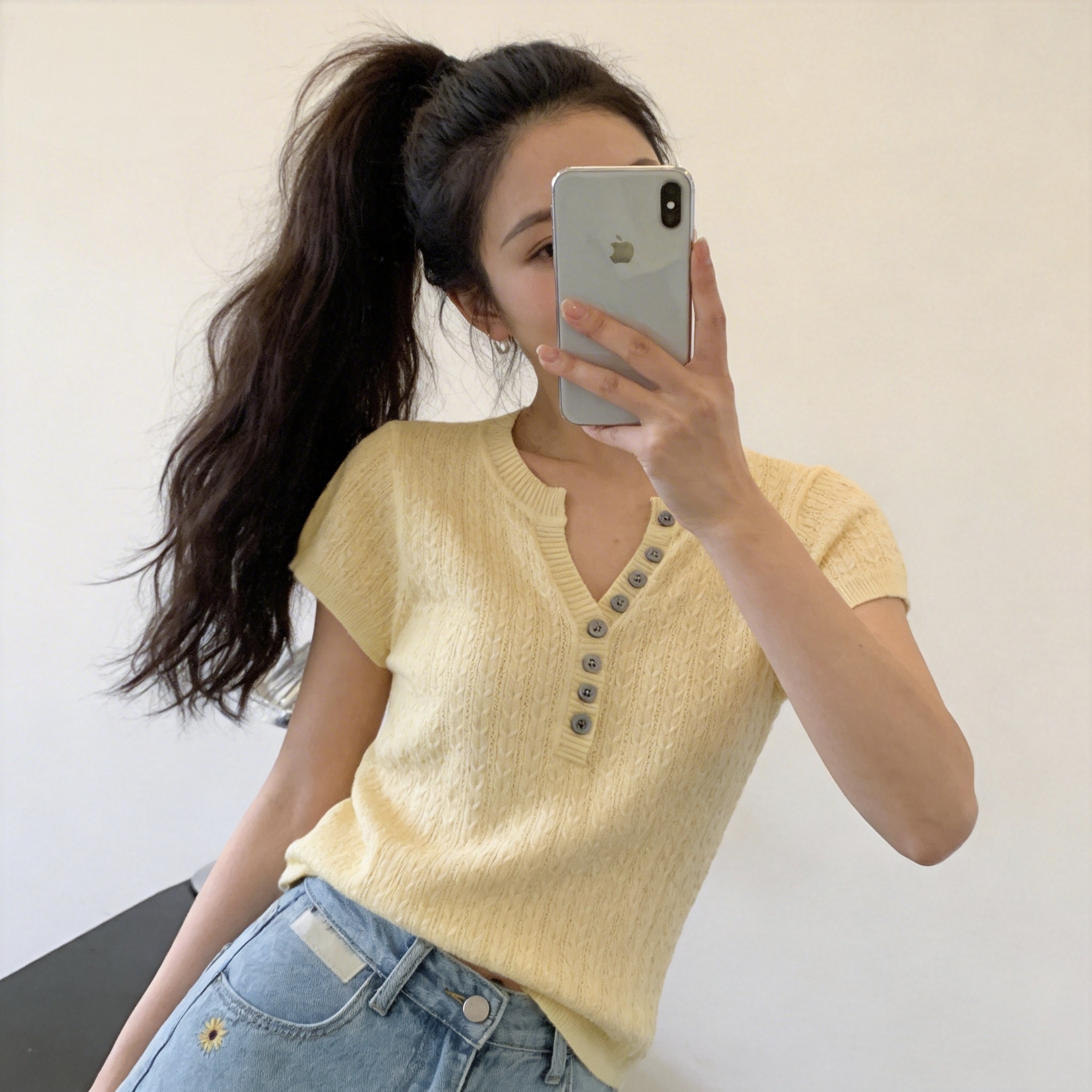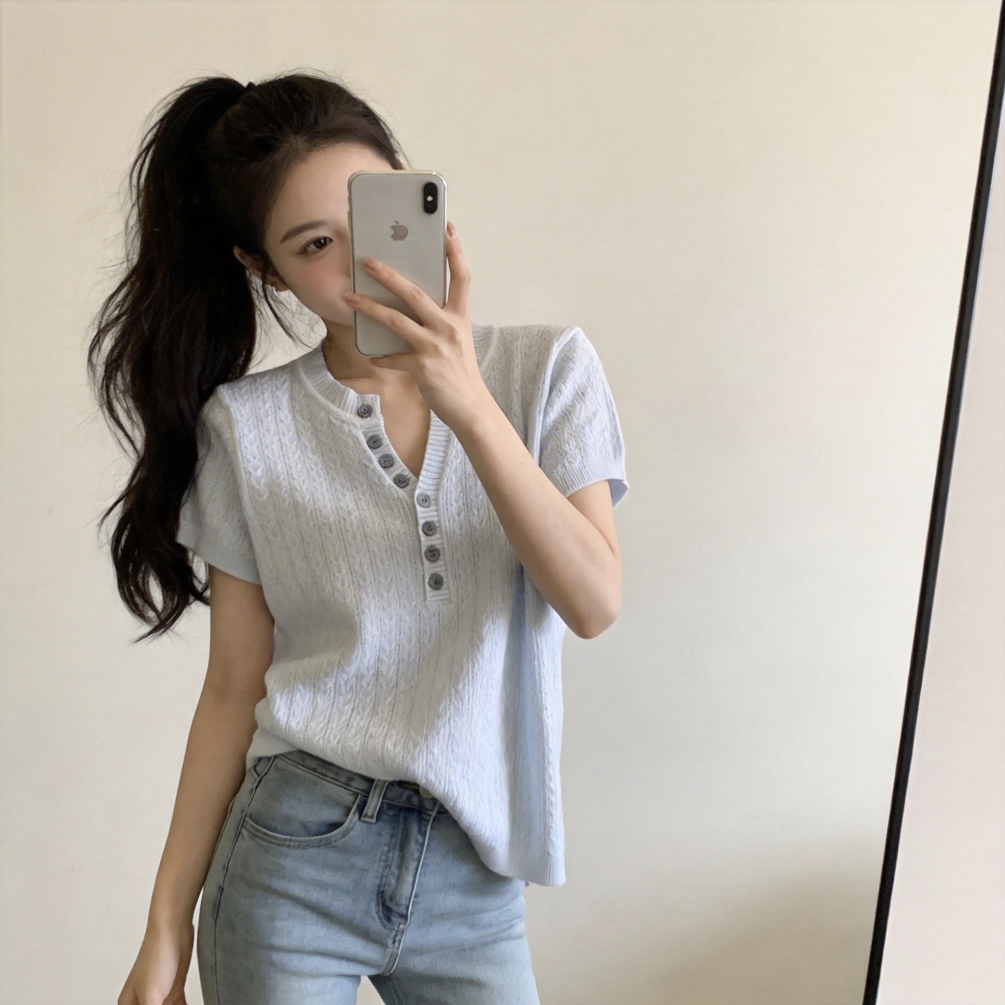 BY11681# 韩系半开领V领正肩短袖针织t恤女夏季新款修身显瘦打底衫上衣 服裝批發女裝批發服飾貨源