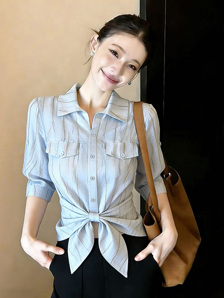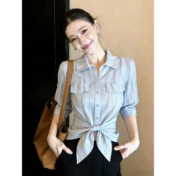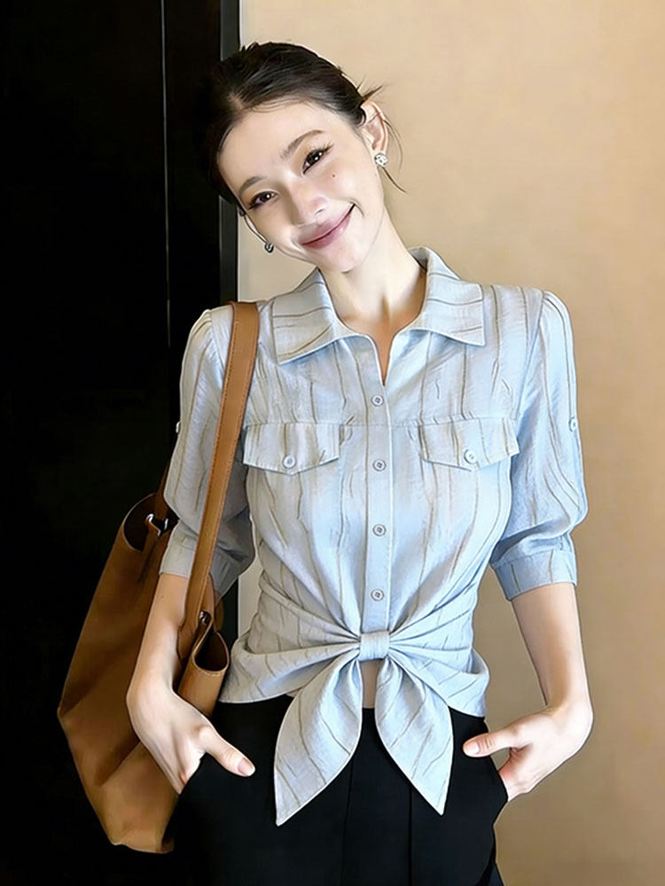BY11687# 优雅风蓝色条纹拼接单排扣衬衫女夏季绑结收腰显瘦设计感衬衣 服裝批發女裝批發服飾貨源
