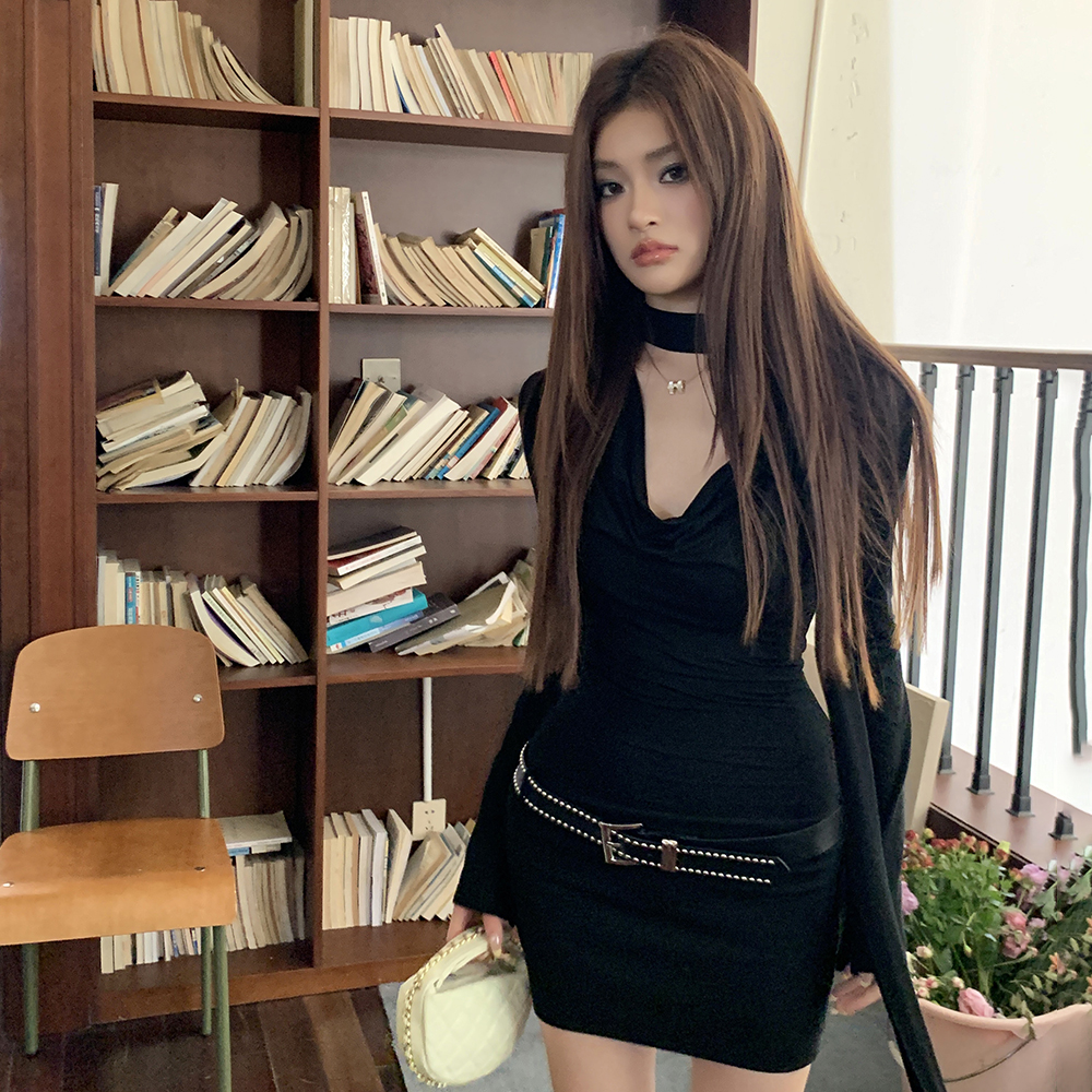 BY11696# 春装新款辣妹连衣裙女设计感荡领御姐风长袖黑色包臀短裙 服裝批發女裝批發服飾貨源
