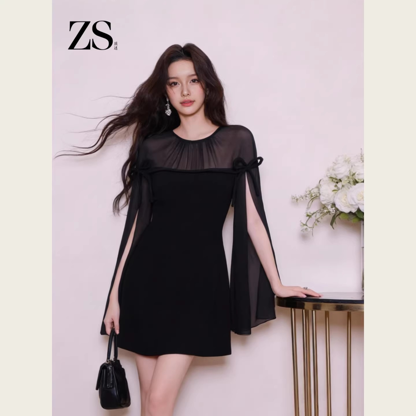 BY11724# 独立设计师款千金风网纱长袖连衣裙女年末晚会穿搭小黑裙 服裝批發女裝批發服飾貨源