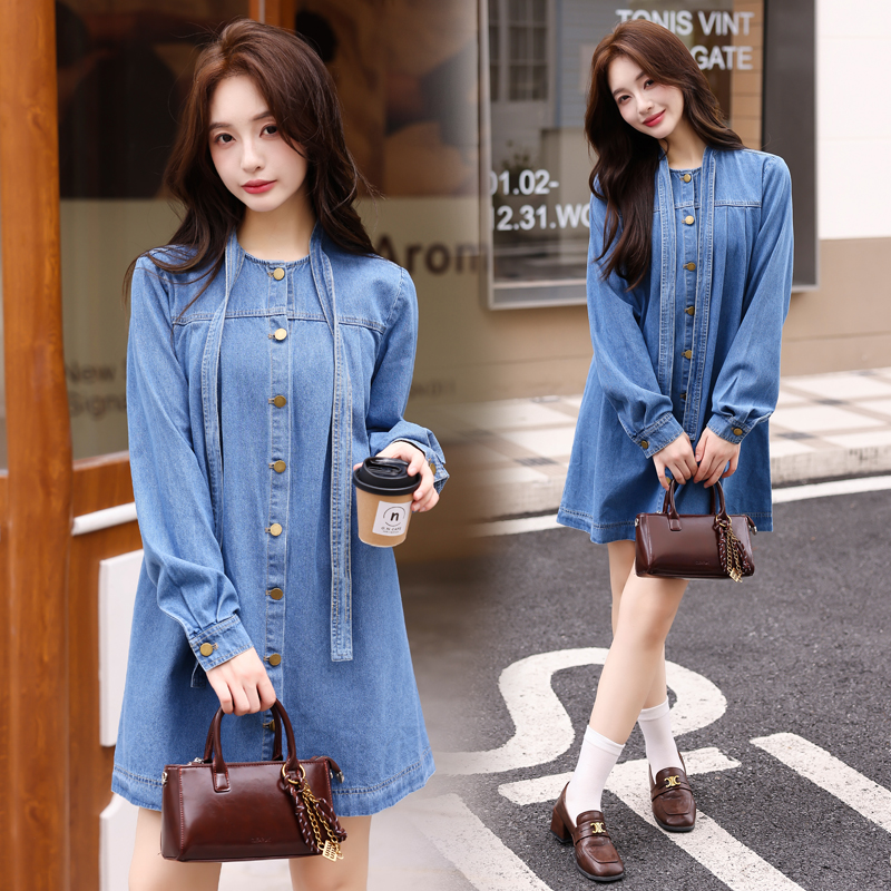 BY11831# 复古蝴蝶结牛仔连衣裙秋季度假裙子长袖小众不撞款a字连身裙 服裝批發女裝批發服飾貨源