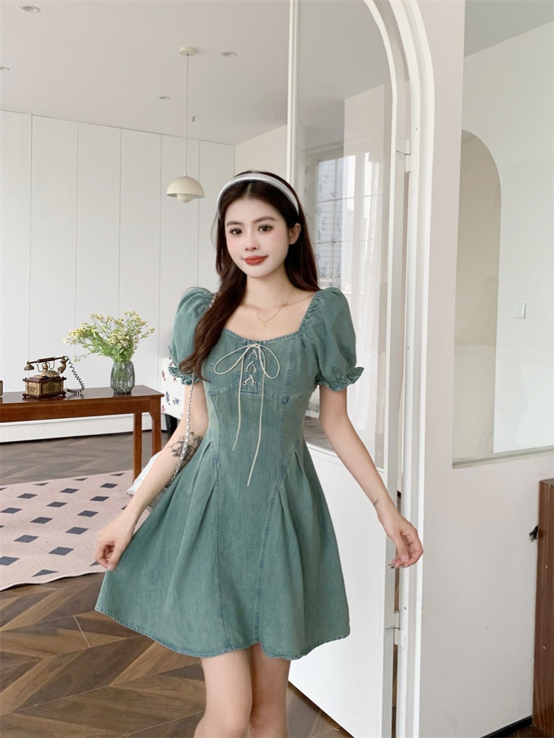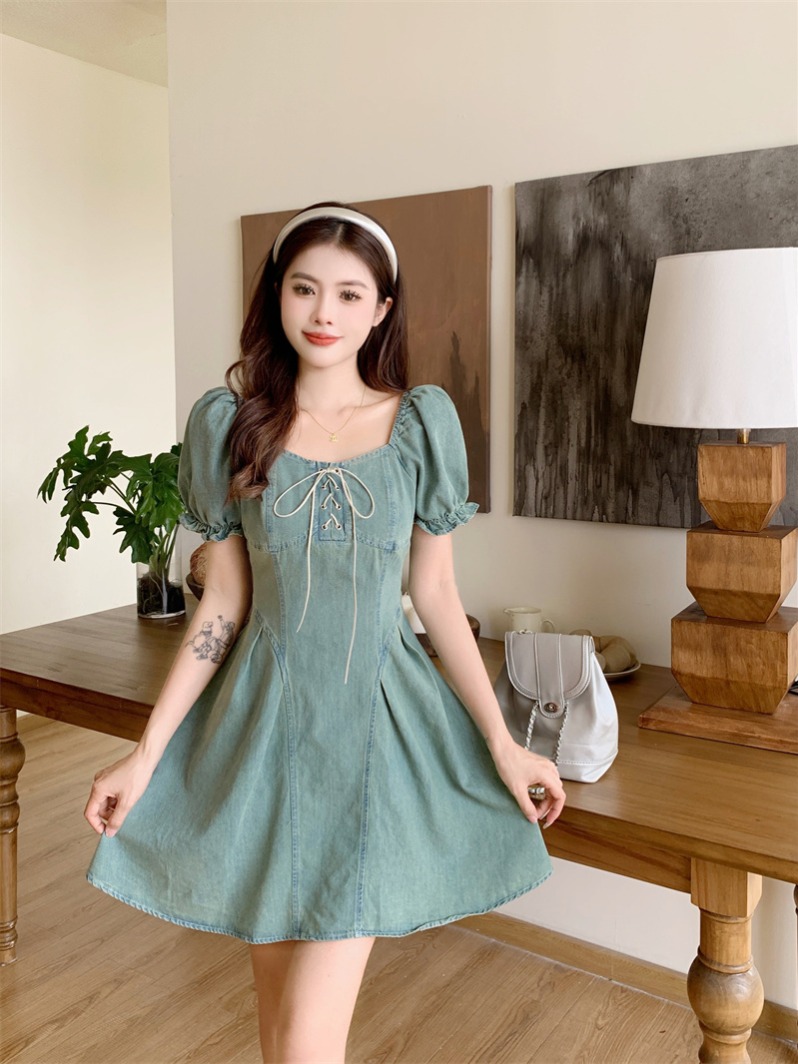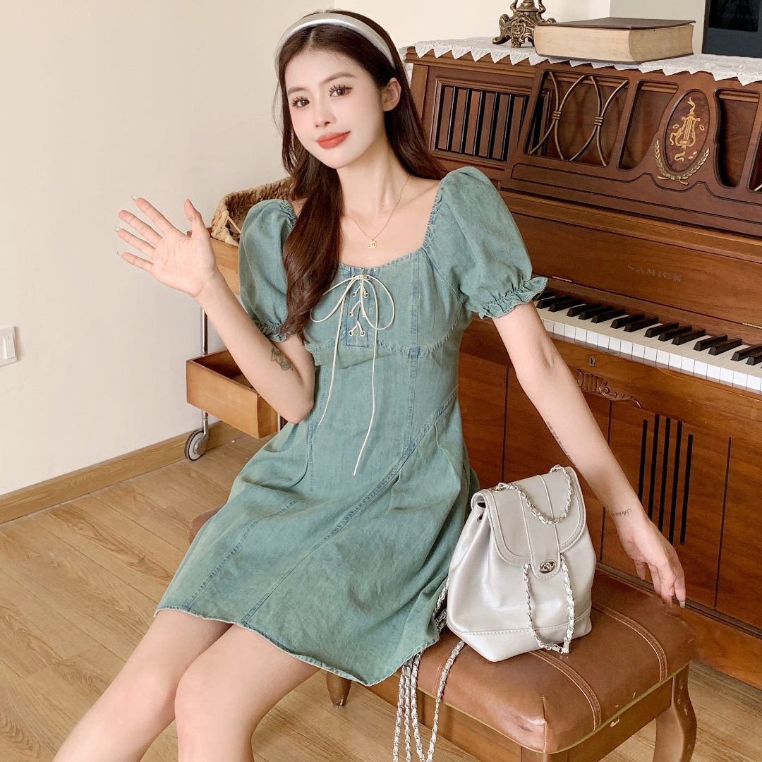 BY11834# ~大码女装方领泡泡袖系带时尚显瘦薄牛仔连衣裙 服裝批發女裝批發服飾貨源
