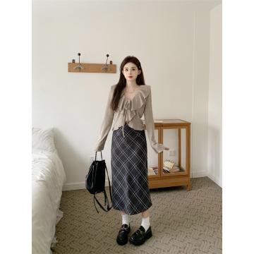 Home > 韩版套装 > BY11835# ~大码女装V领荷叶边长袖针织衫上衣+高腰格子半身裙 服裝批發女裝批發服飾貨源