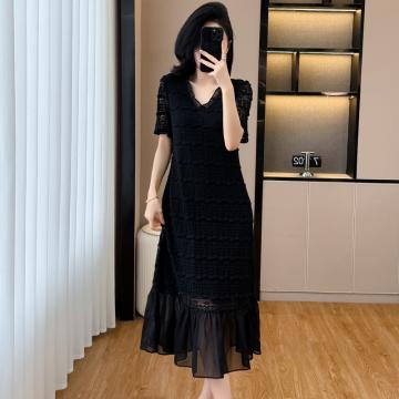 BY11841# 高端轻奢蕾丝肌理感连衣裙女夏大码法式优雅气质v领超显瘦小黑裙 服裝批發女裝批發服飾貨源