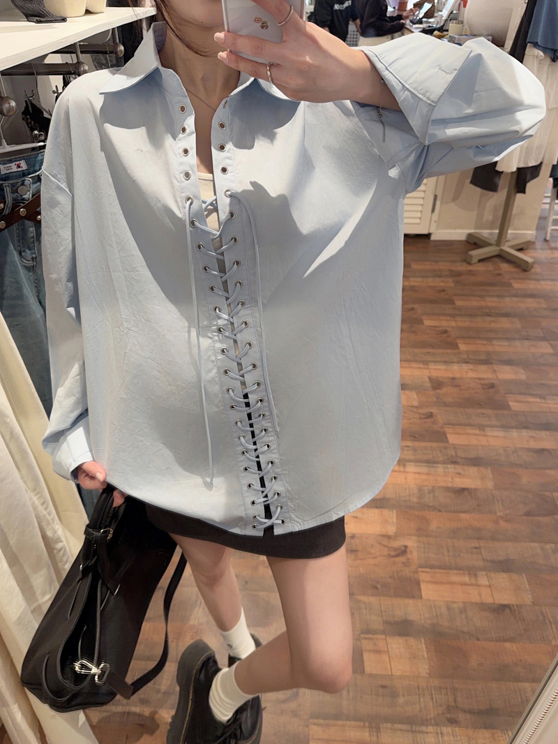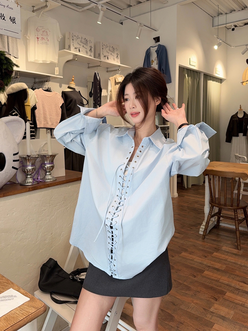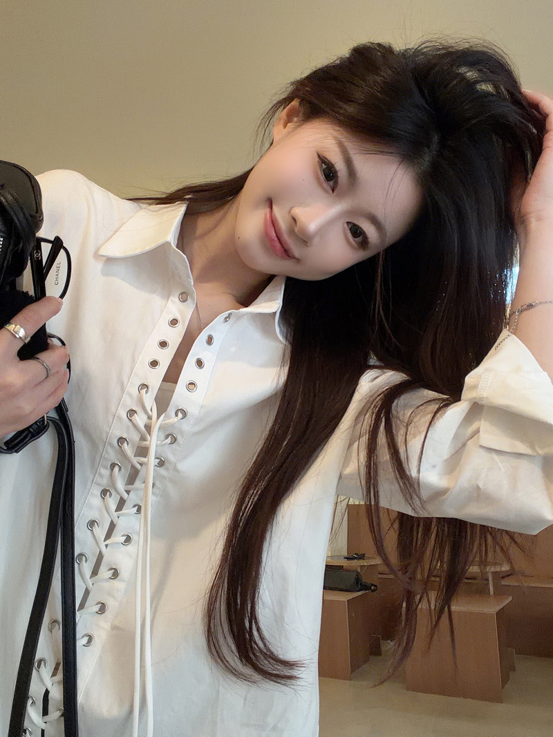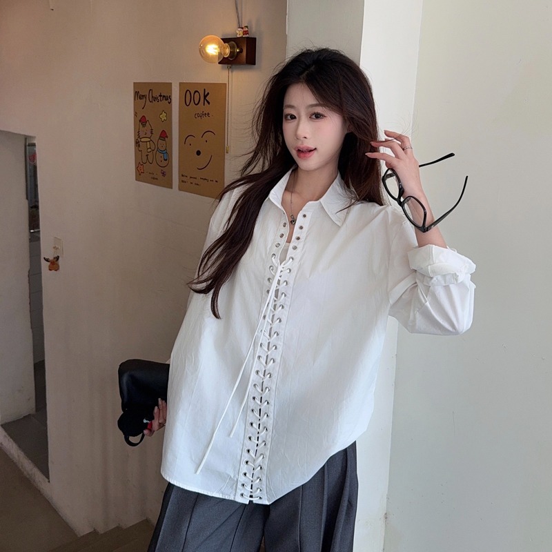 Home > 长袖雪纺衫、衬衫、上衣 > BY11997# 韩系时髦小众设计感铆钉打孔系带休闲白色衬衫女长袖新款上衣 服裝批發女裝批發服飾貨源