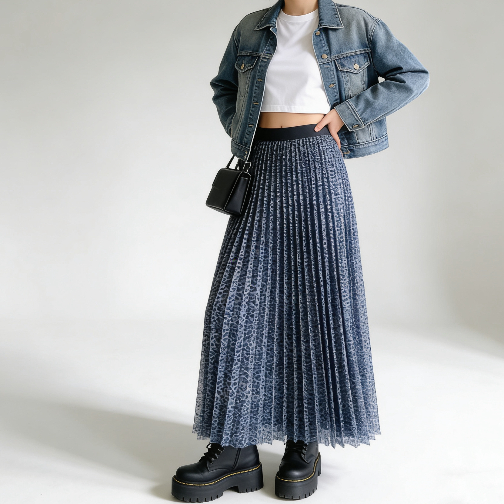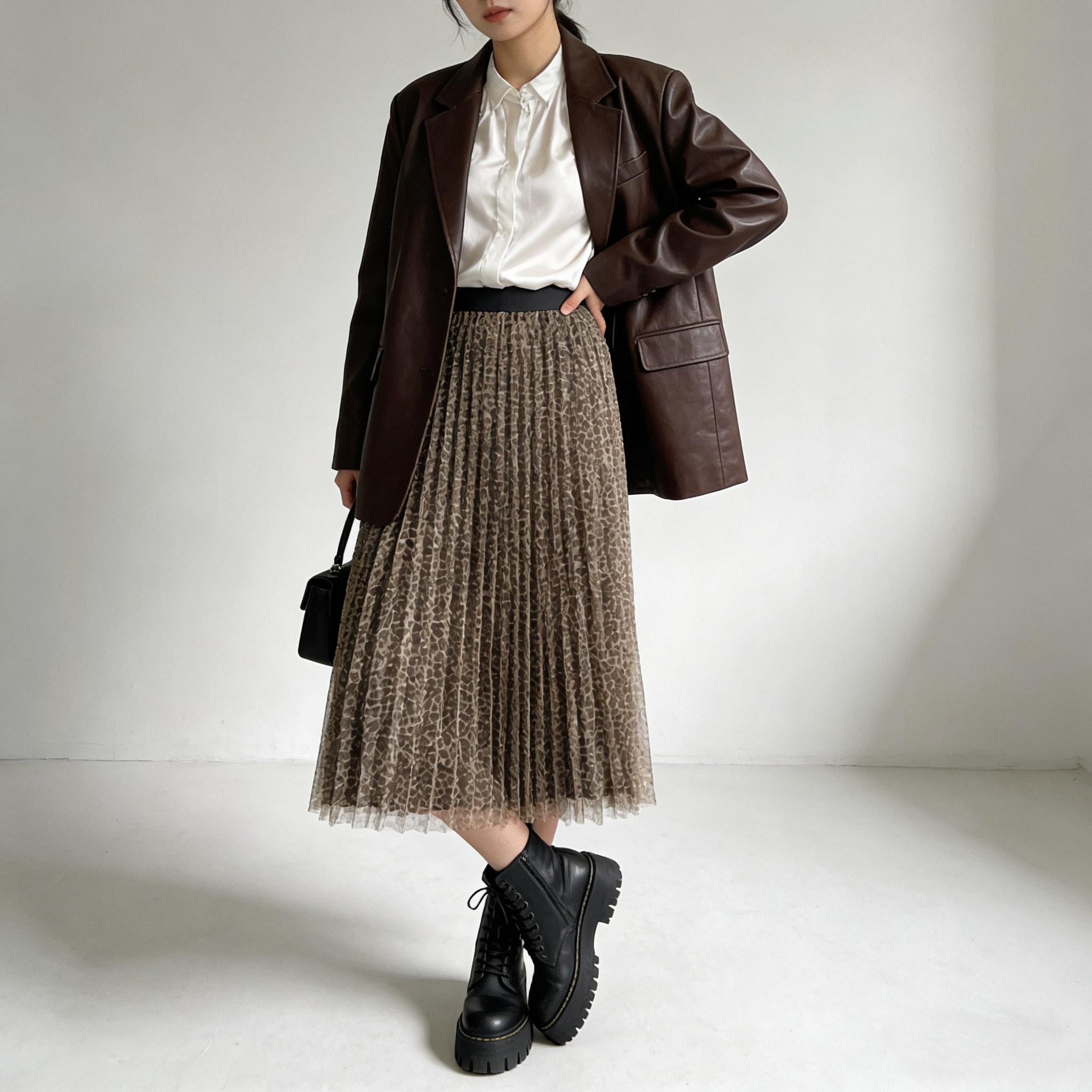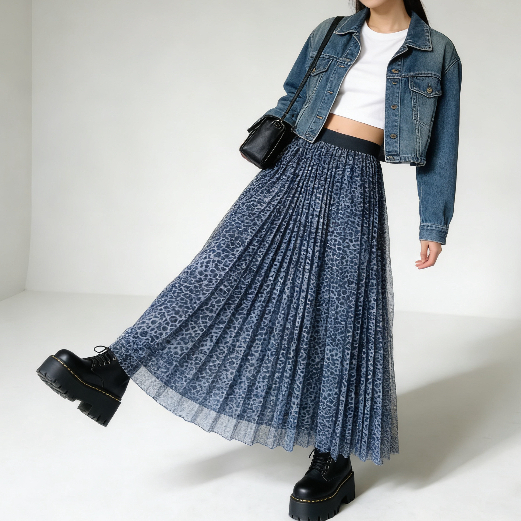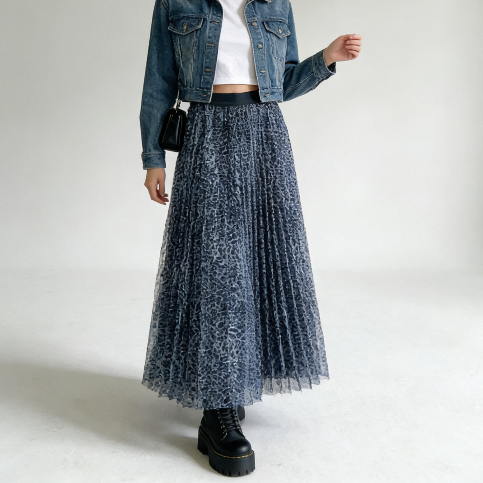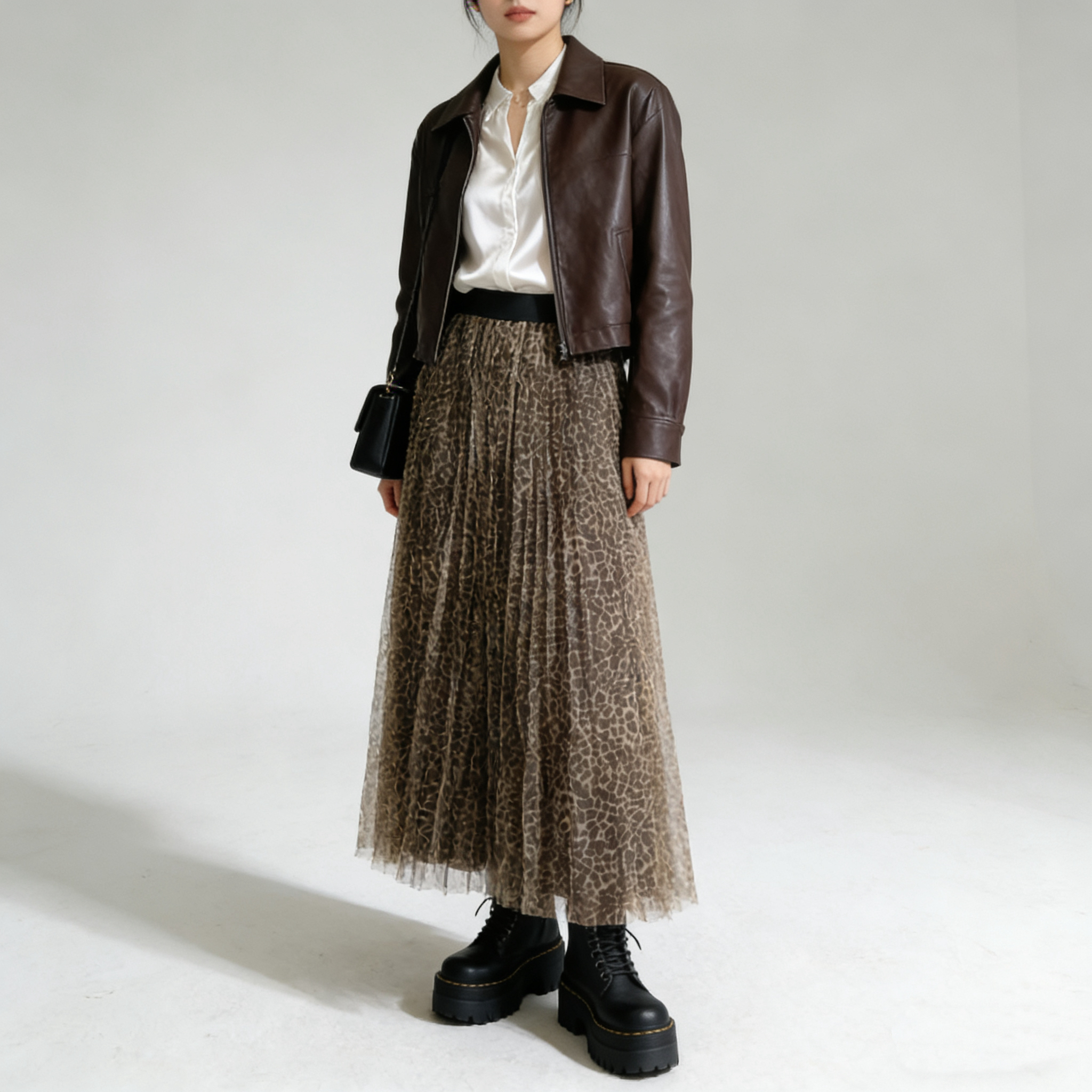 BY12021# 复古豹纹压褶半身裙高腰垂坠网纱长裙韩系温柔百褶裙春夏季款 服裝批發女裝批發服飾貨源