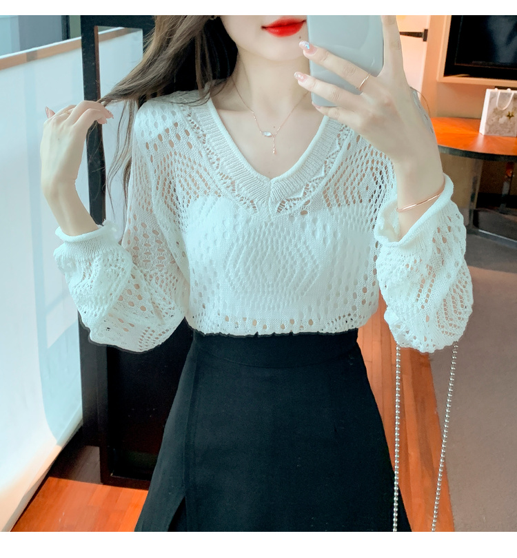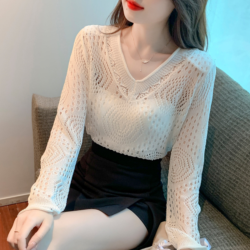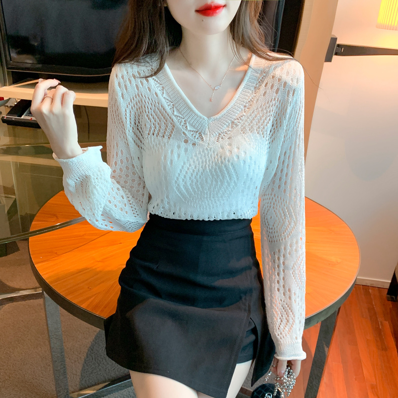 BY12042# 春季新款韩版V领套头短款长袖冰丝防晒罩衫小心机上衣女 服裝批發女裝批發服飾貨源