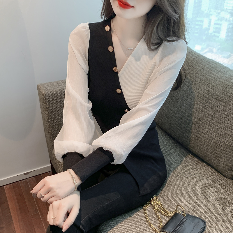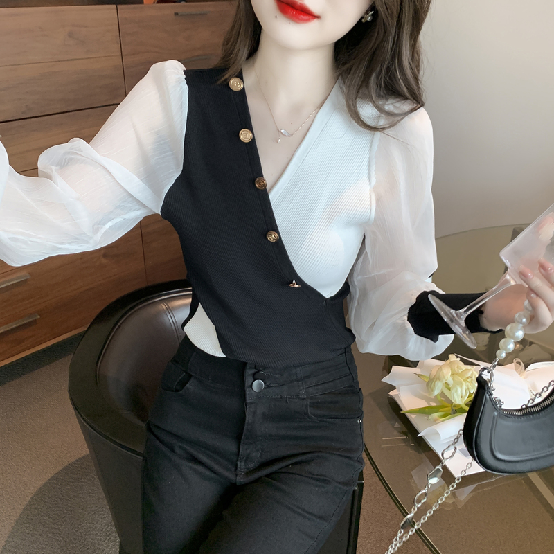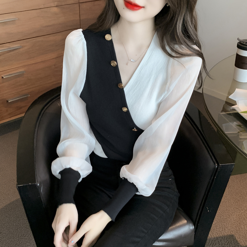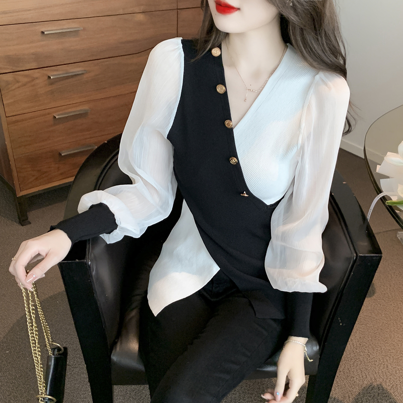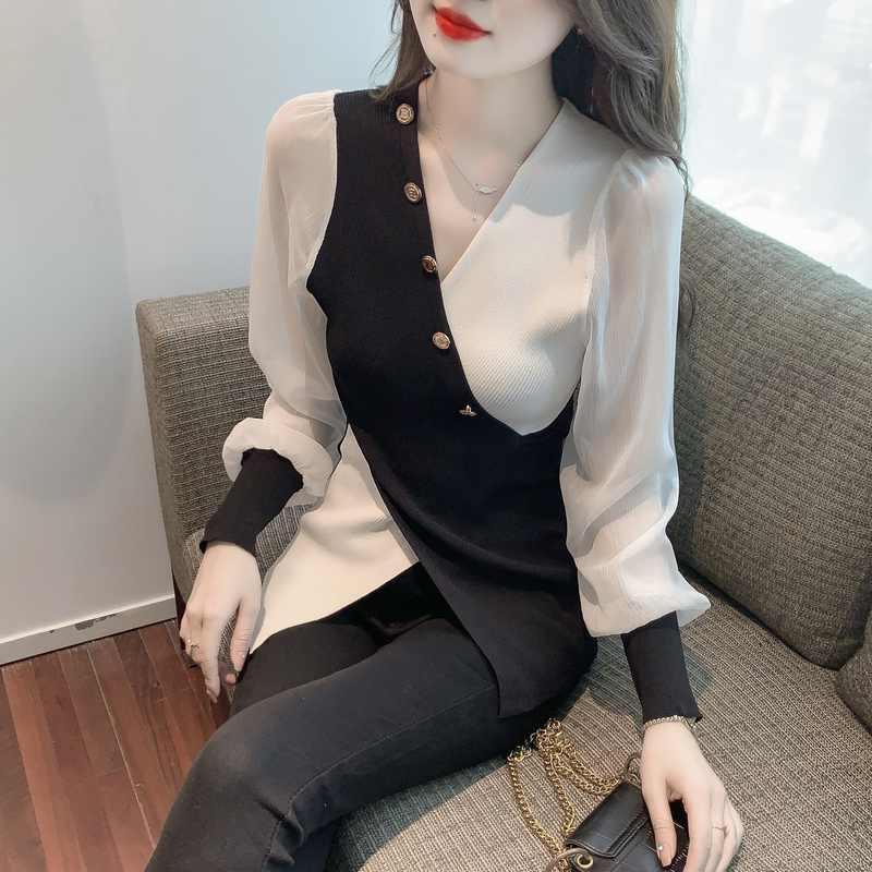 BY12045# 春季新款韩版拼接雪纺袖特色款修身打底衫针织衫 服裝批發女裝批發服飾貨源