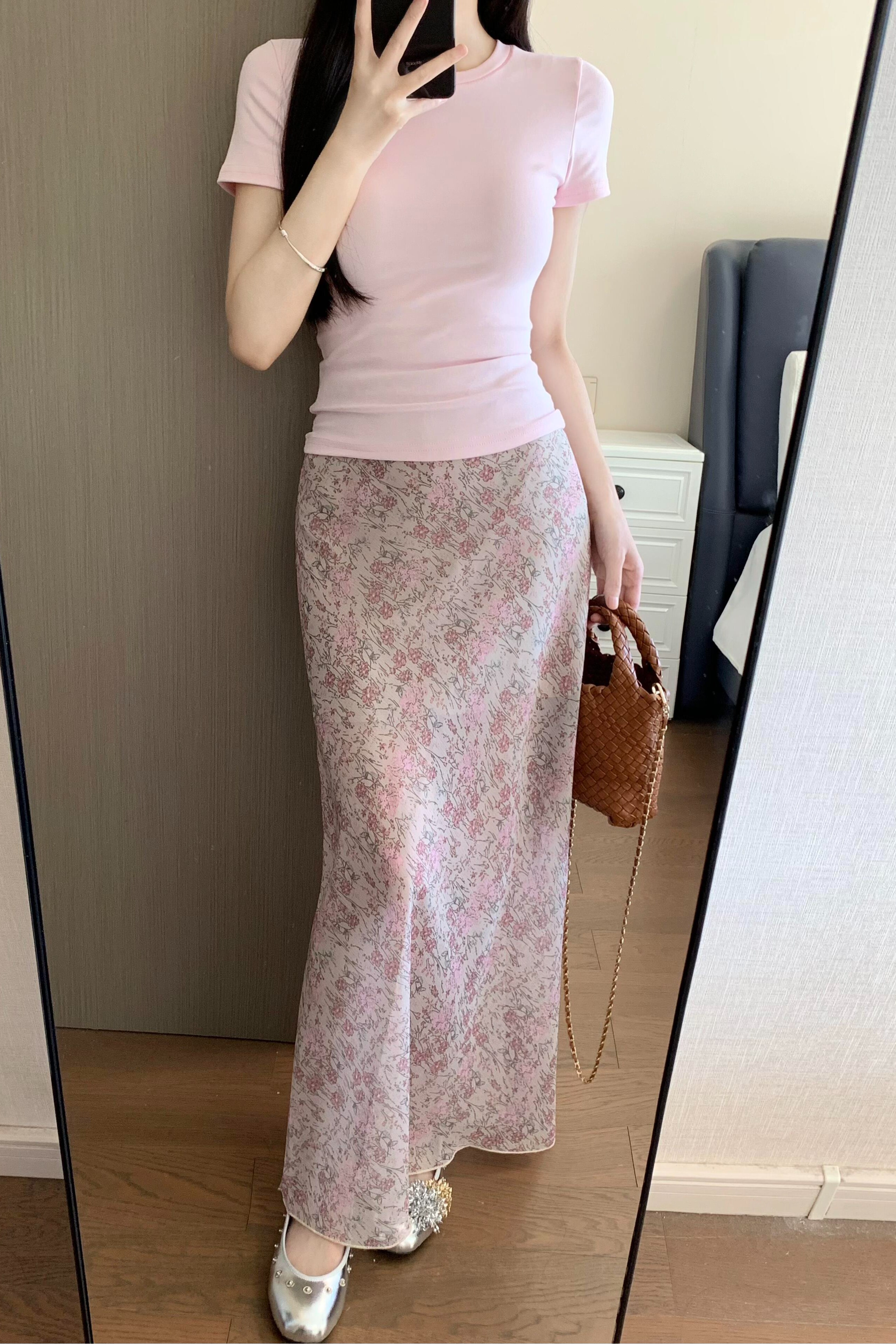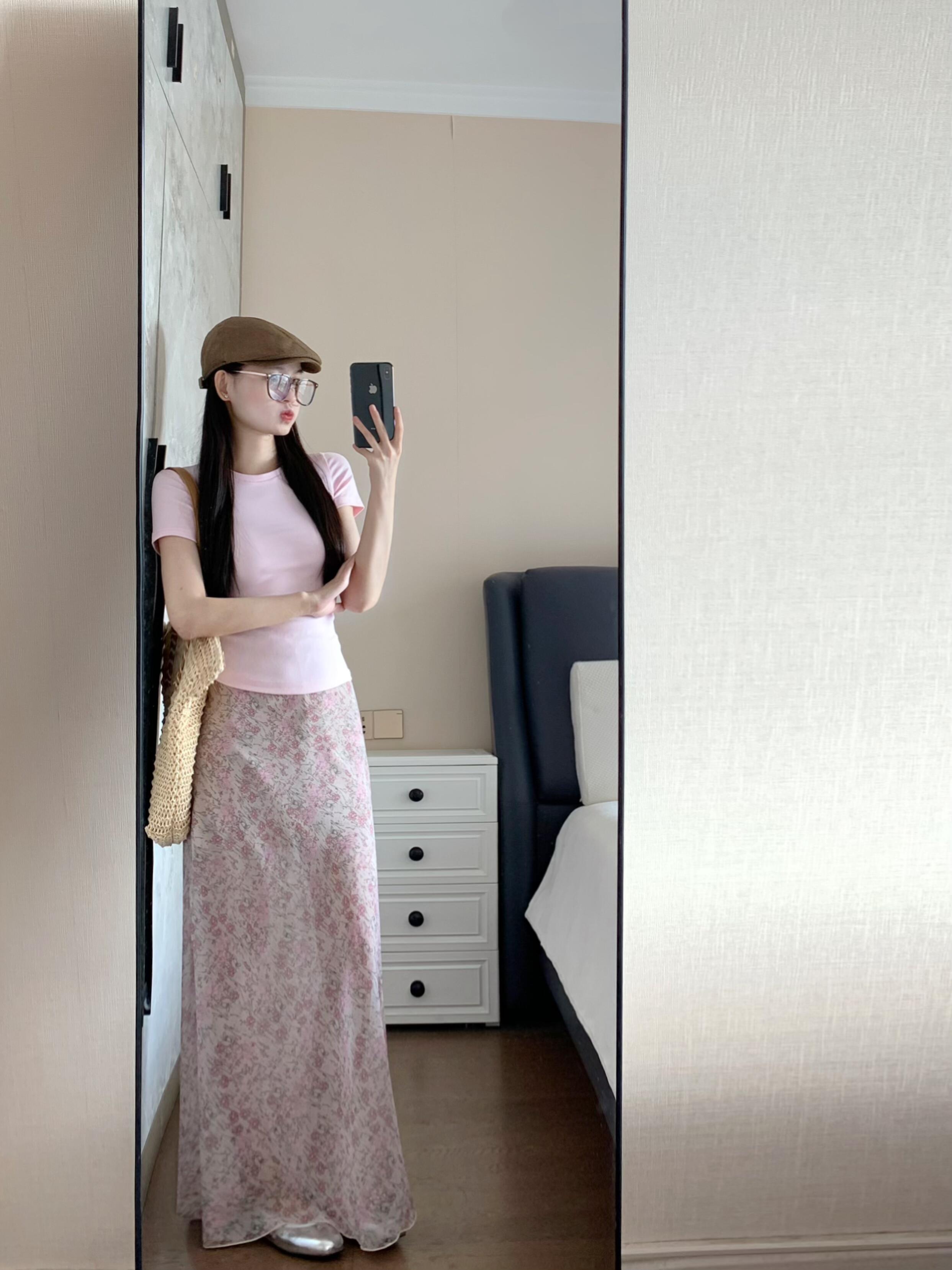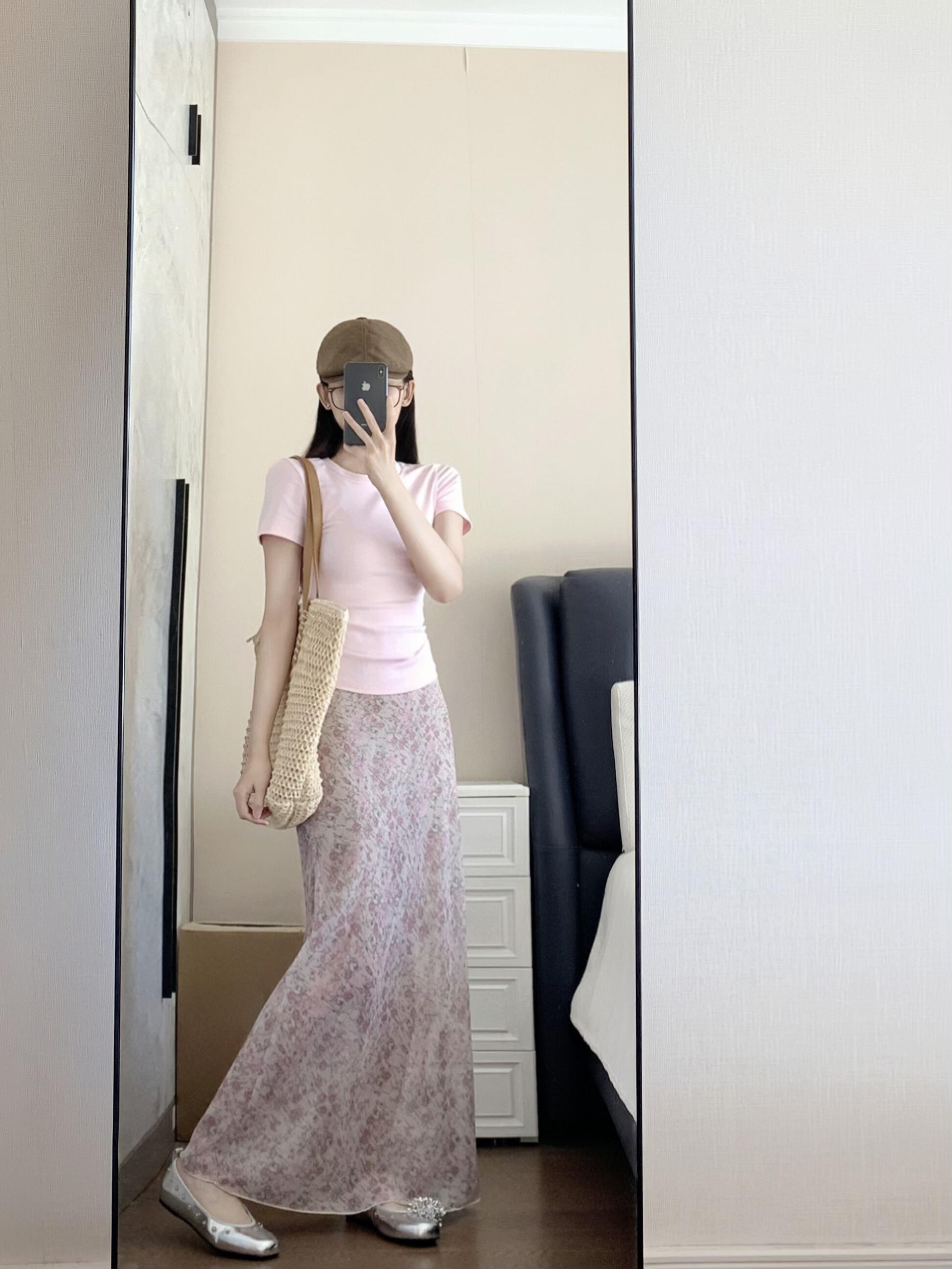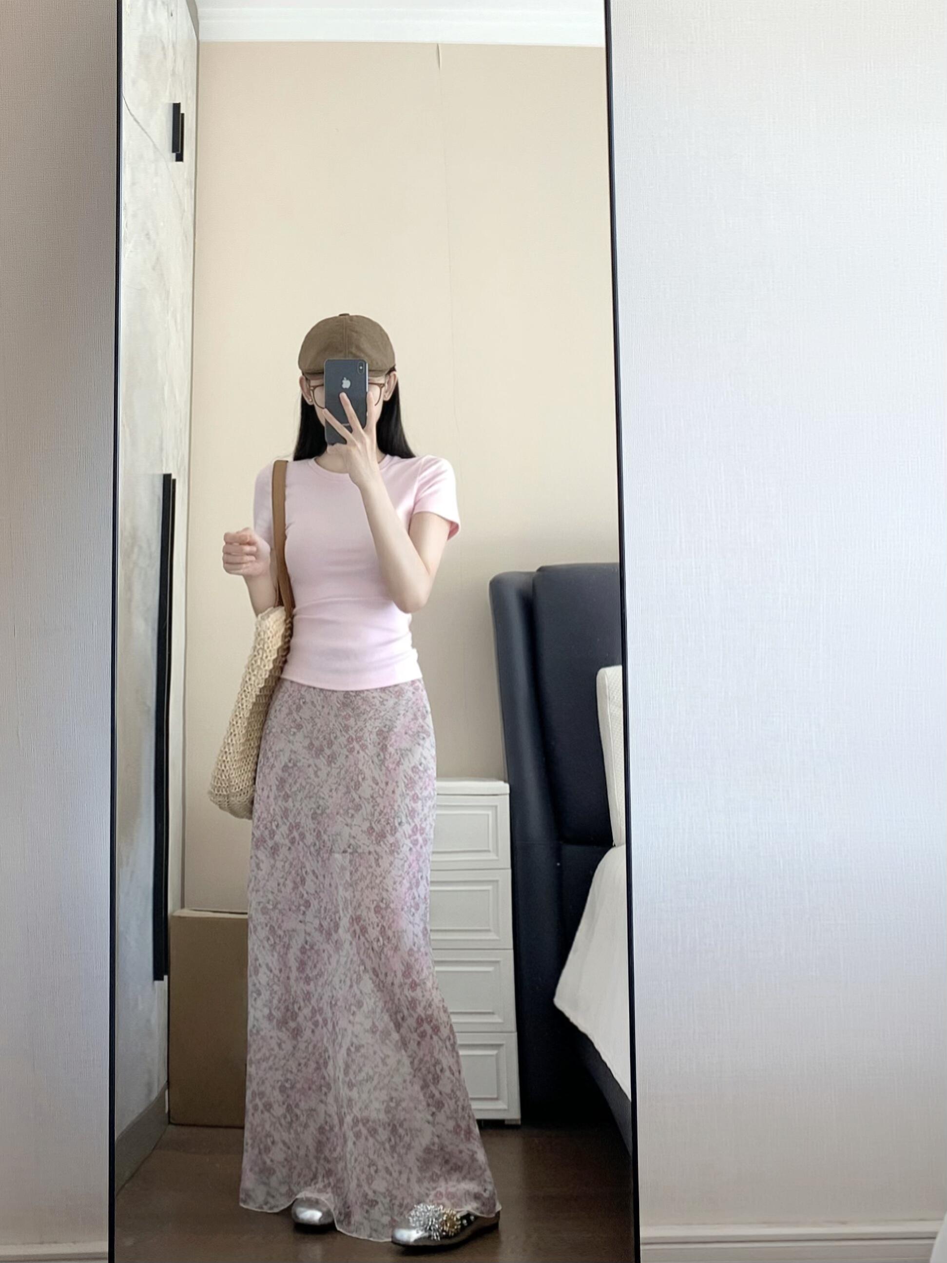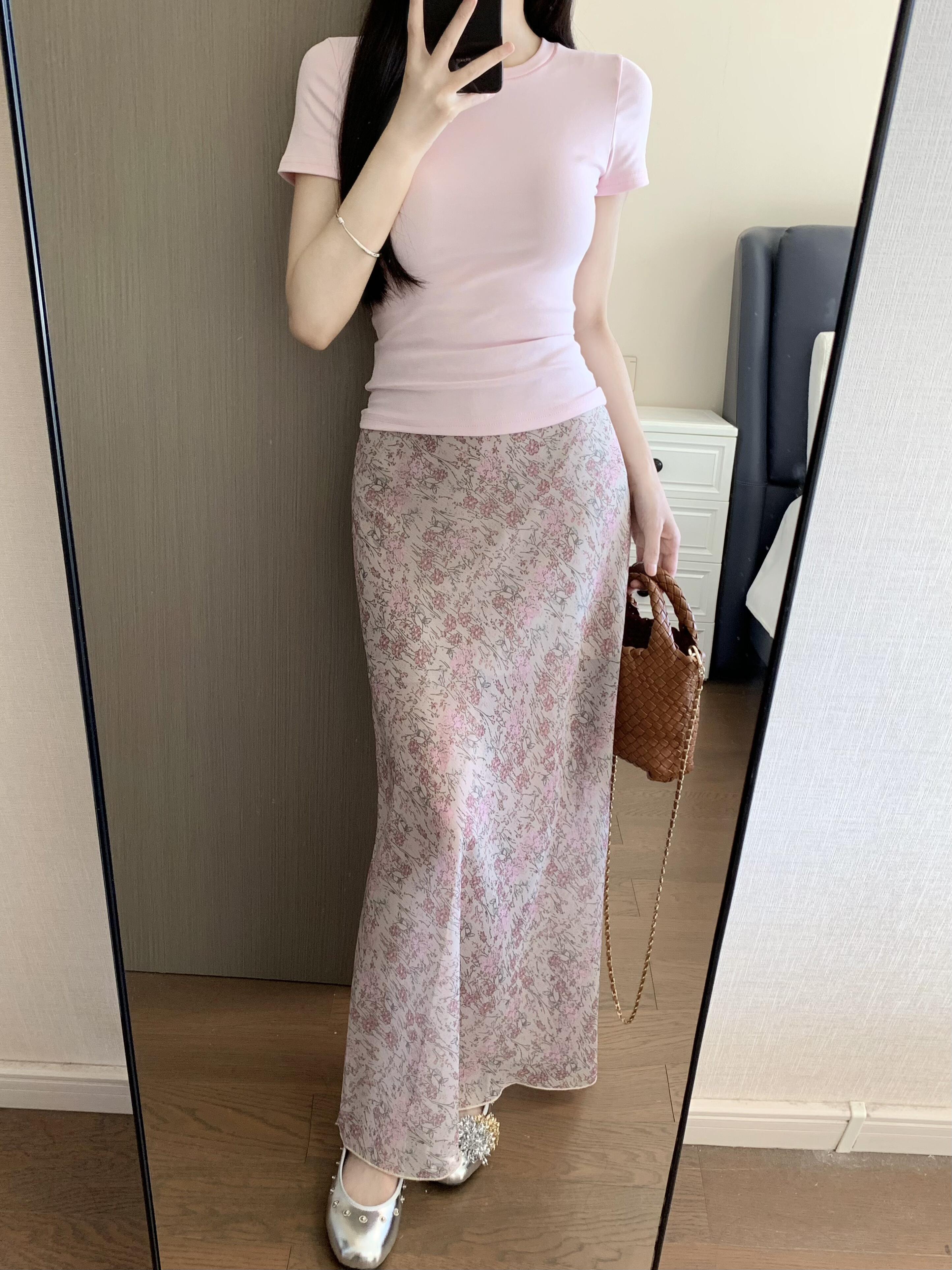 BY12134# 品质五线打边粉色碎花半身裙女高腰中长款鱼尾裙 服裝批發女裝批發服飾貨源