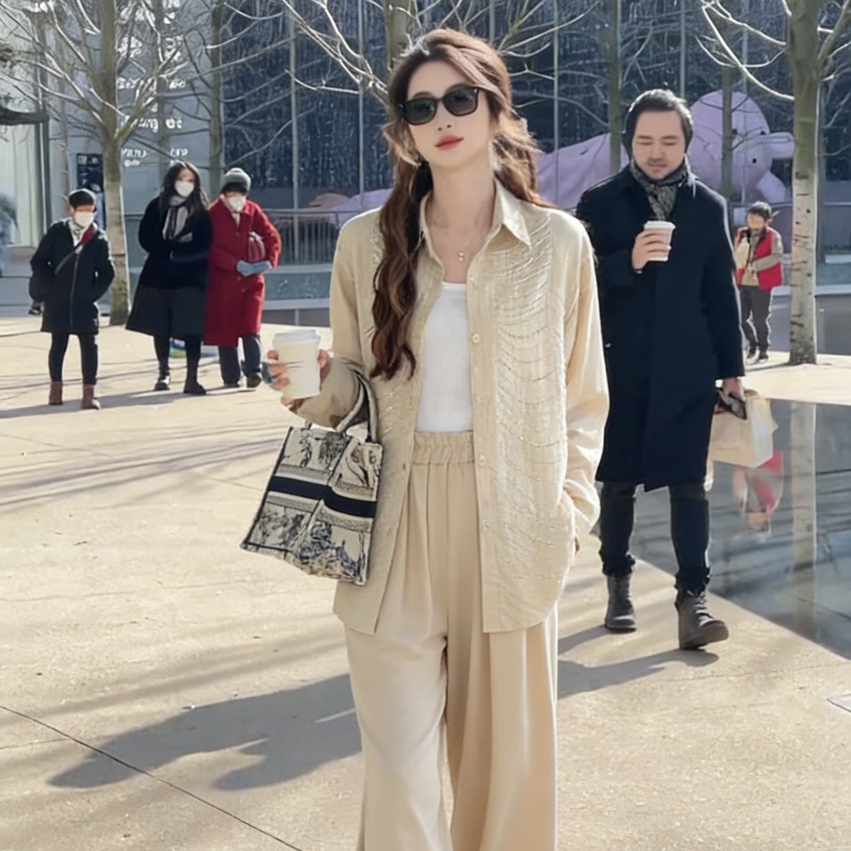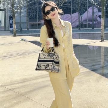 BY12239# 春季休闲两件套穿搭女宽松时尚烫钻长袖单排扣衬衫高腰阔腿裤套装 服裝批發女裝批發服飾貨源