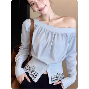 BY12319# YIKE法式温柔风蓝色斜肩露肩衬衫女士设计感气质收腰长袖上衣早春 服裝批發女裝批發服飾貨源