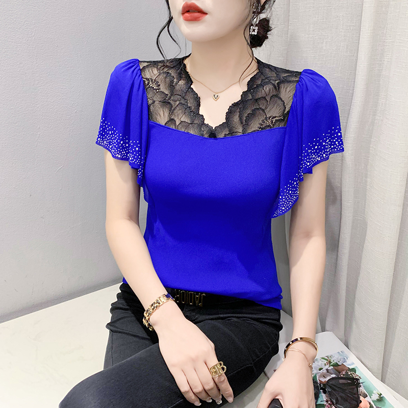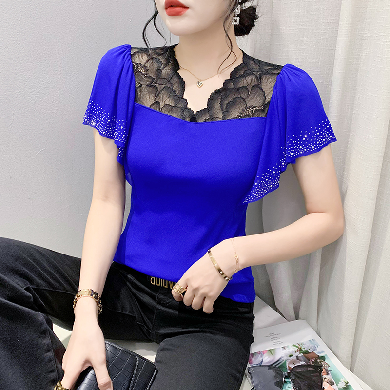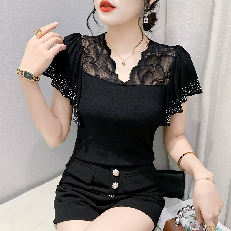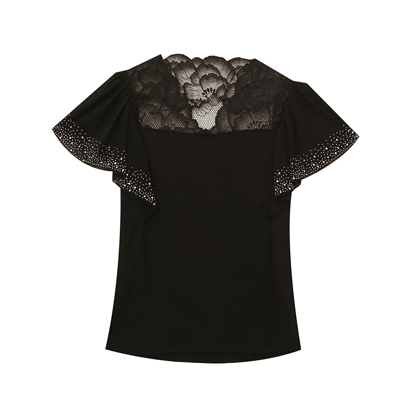 BY12481# 夏季新款性感镂空蕾丝重工艺烫钻双层网荷叶边袖上衣女潮 服裝批發女裝批發服飾貨源