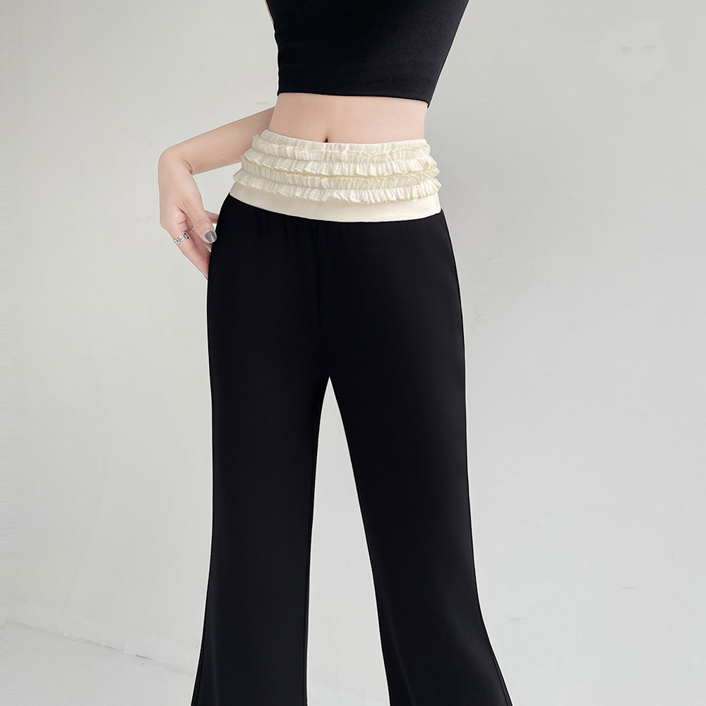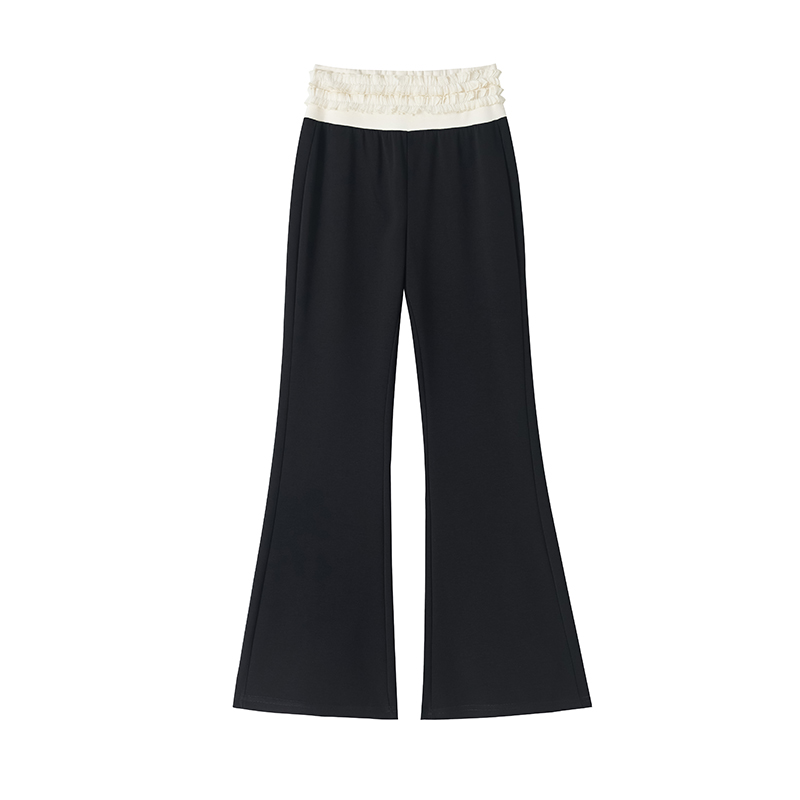 BY12795# 黑色双层花边微喇裤女春夏新款高腰垂感阔腿裤直筒休闲喇叭裤 服裝批發女裝批發服飾貨源