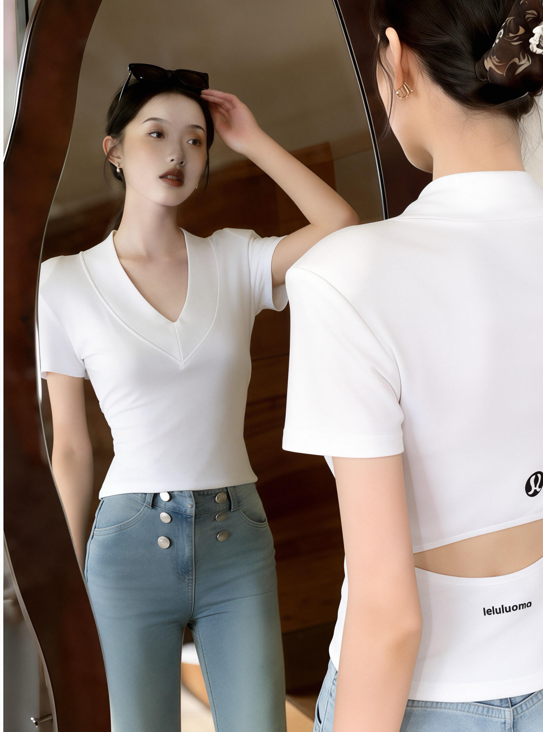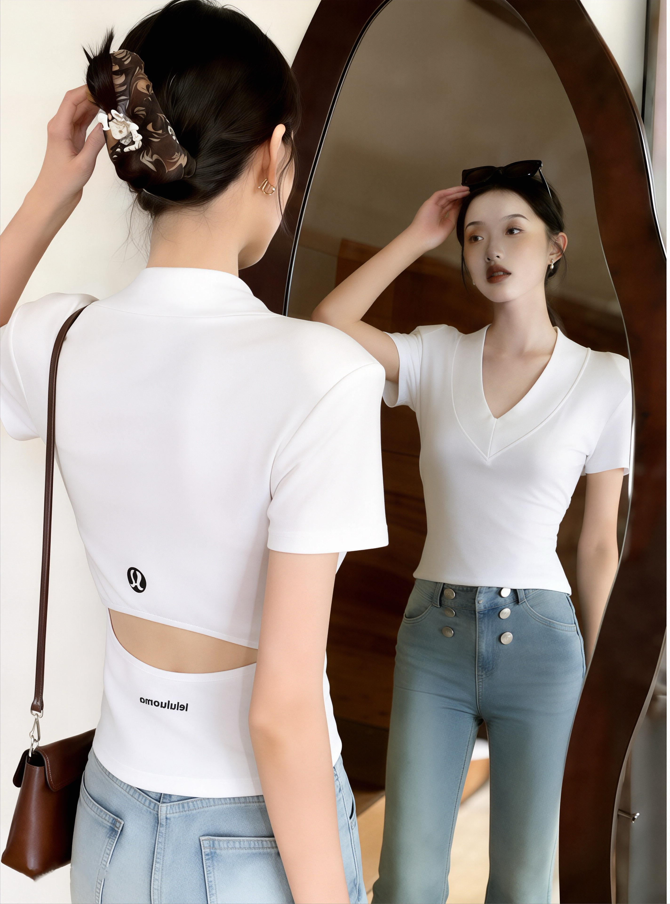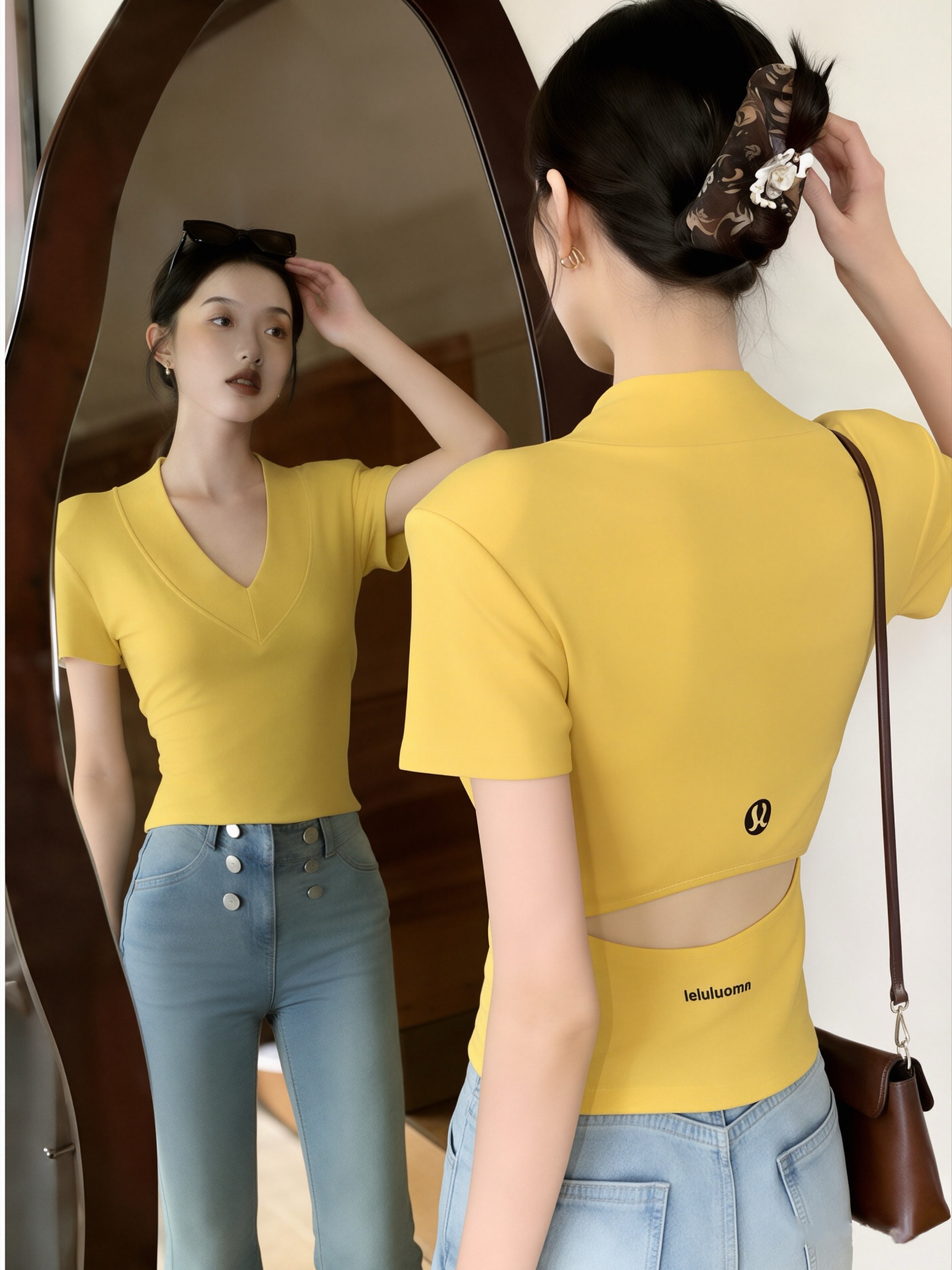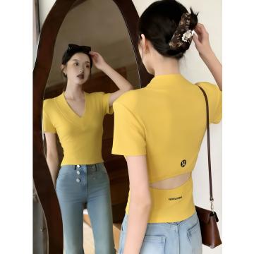 BY13641# 夏季新款韩版时尚气质小心机后背镂空上衣修身短袖T恤短款 服裝批發女裝批發服飾貨源