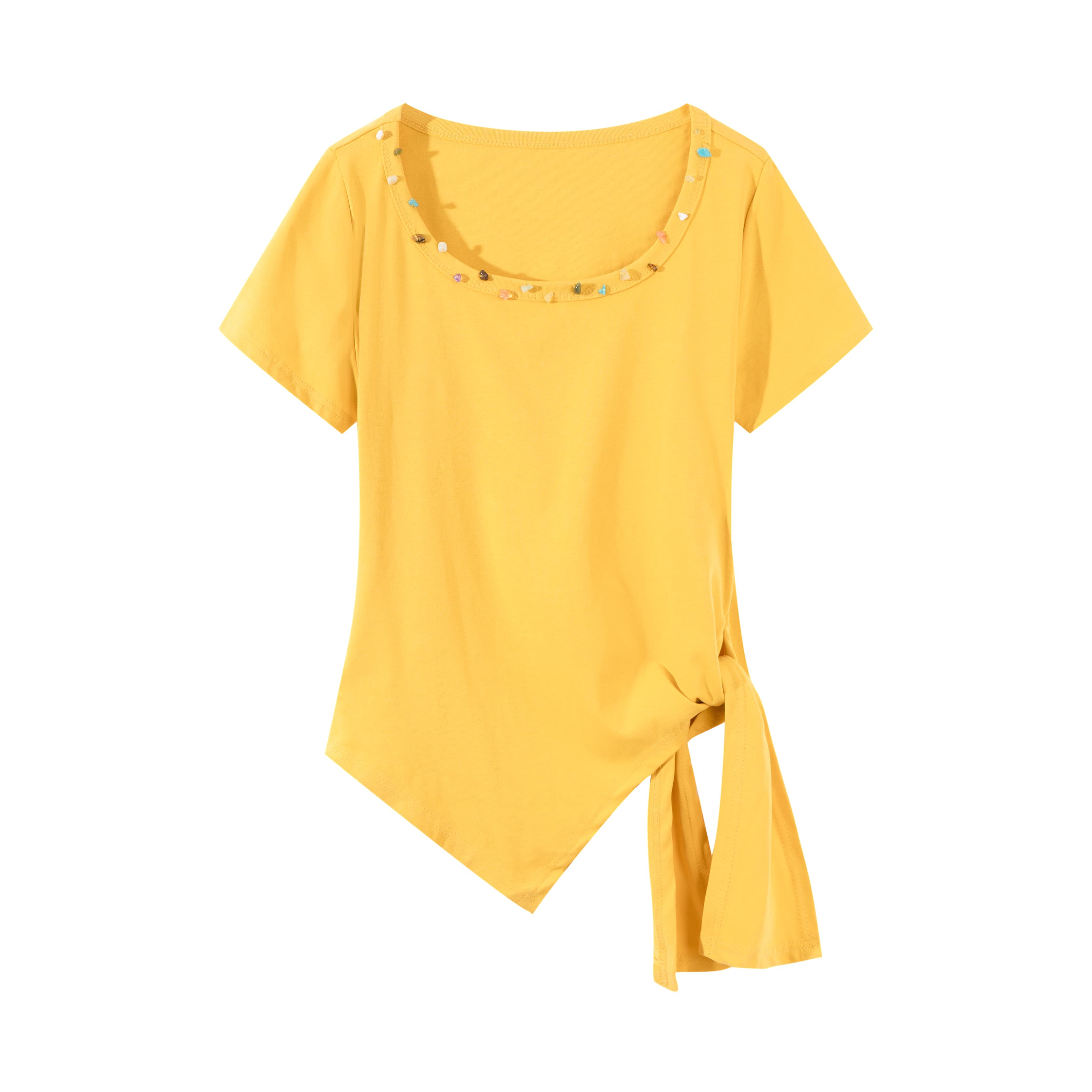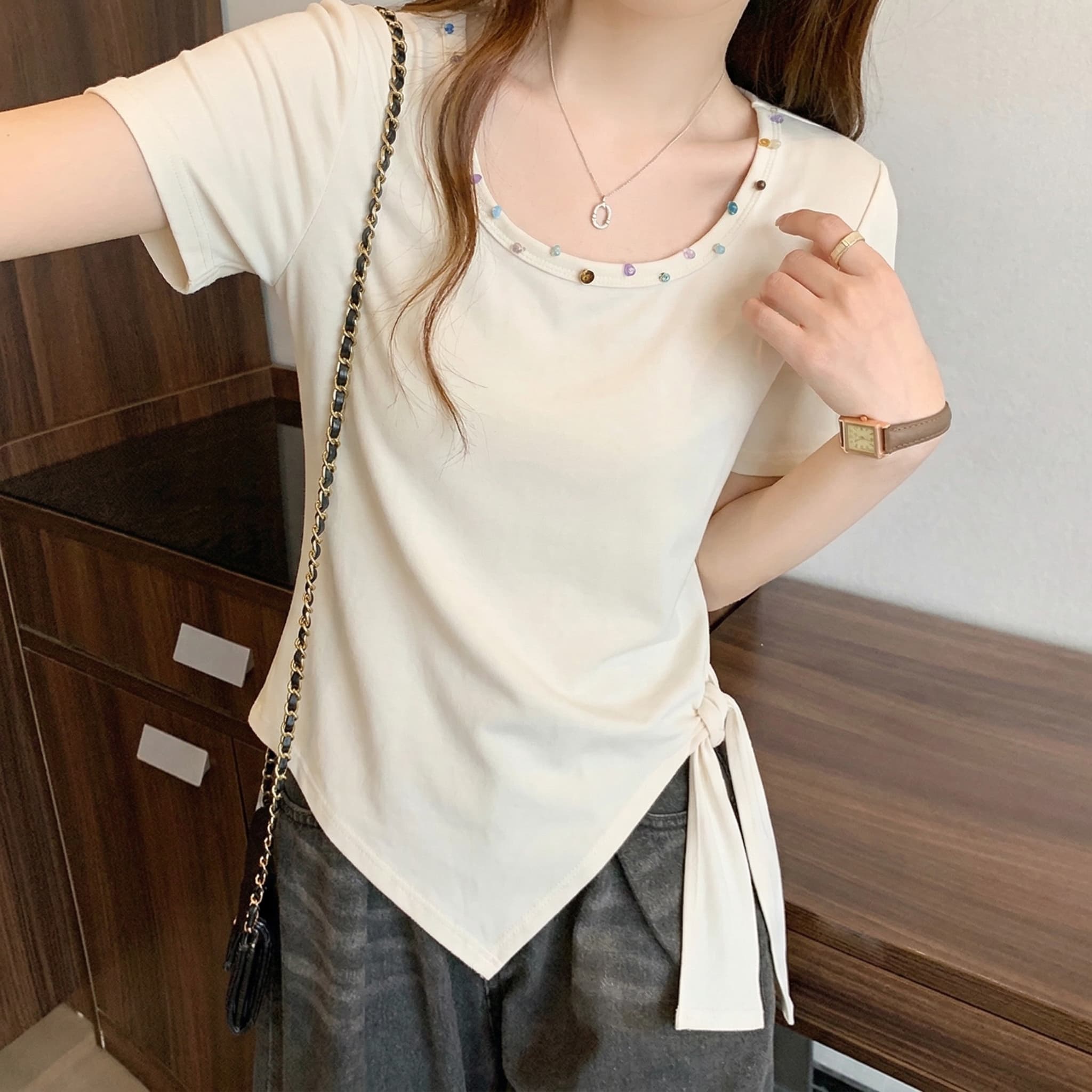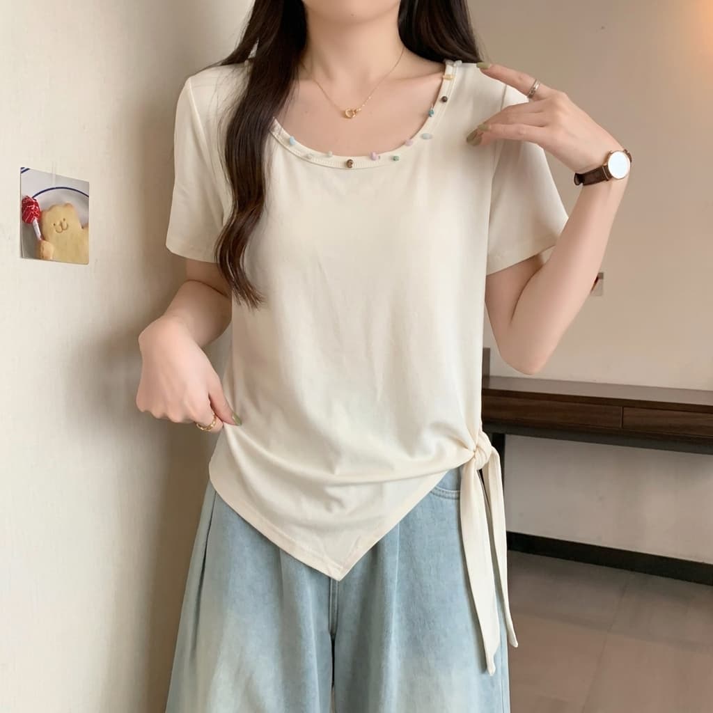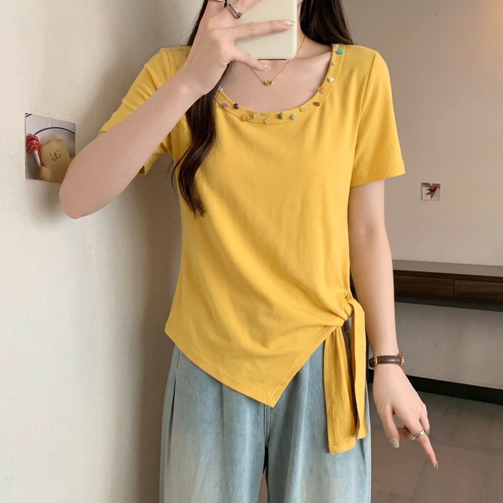 不规则收腰方领短袖t恤女夏季大码胖mm显瘦绑带掐腰遮肉上衣 服裝批發女裝批發服飾貨源