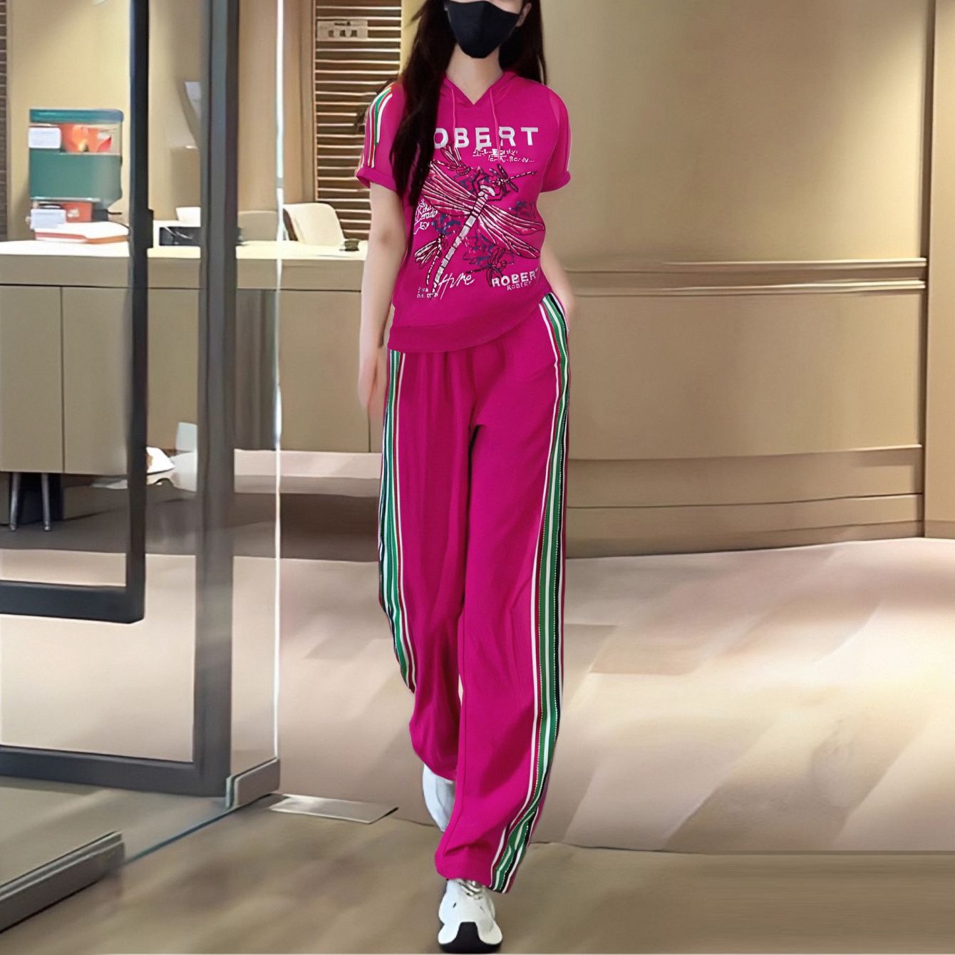 BY15350# 女士休闲服运动套装女春夏季新款粉色连帽宽松短袖T恤两件套服裝批發女裝批發服飾貨源