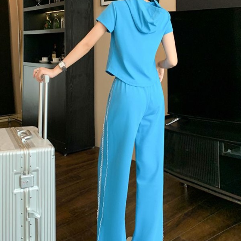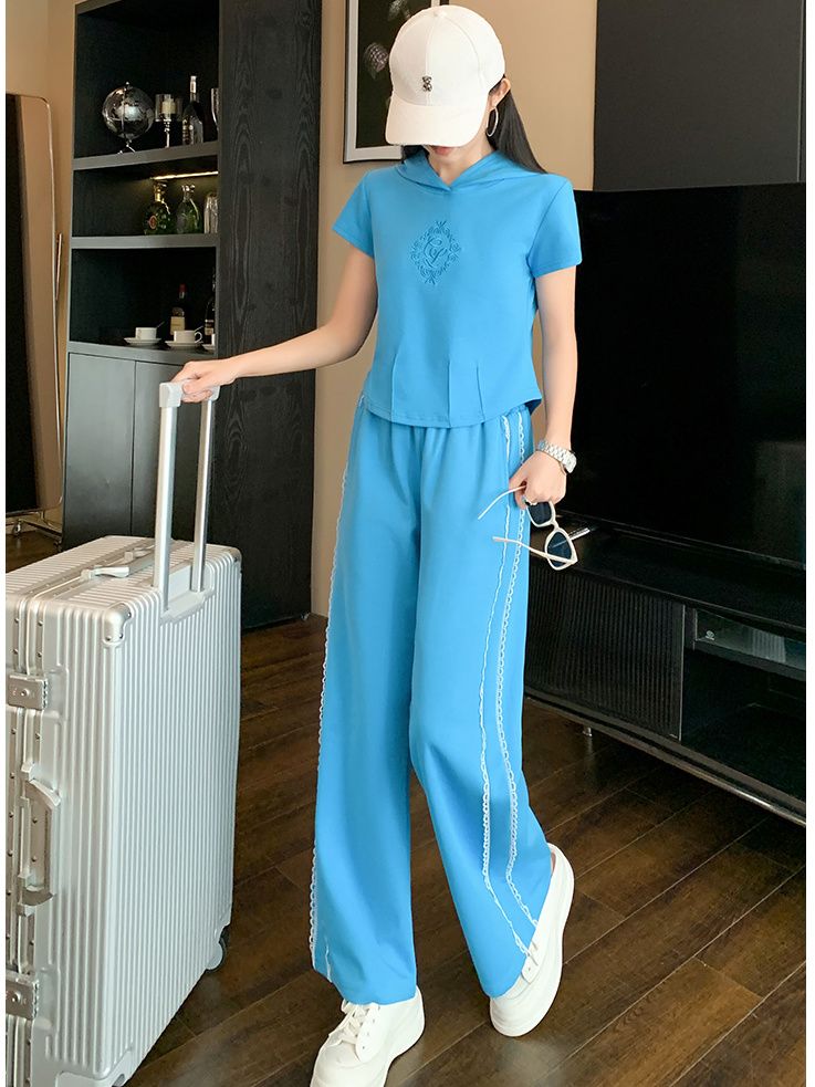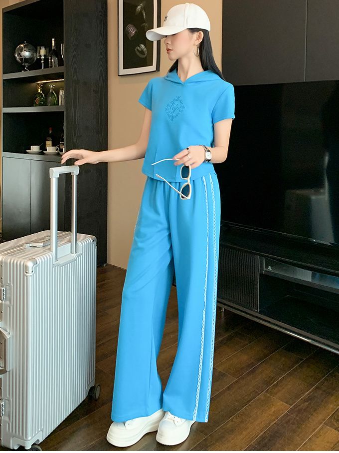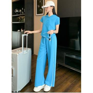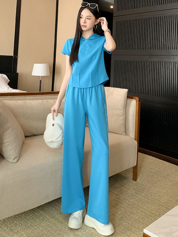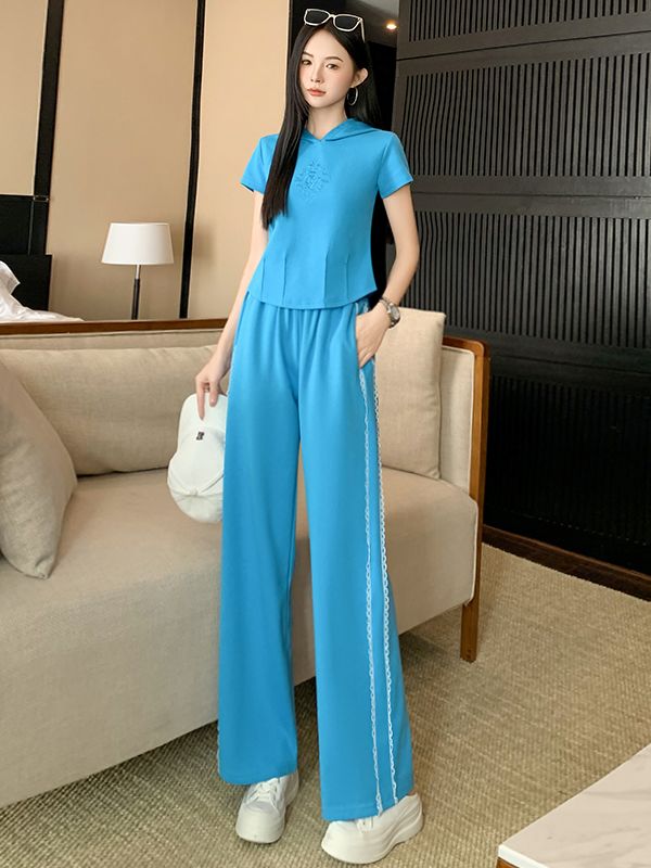 BY15351# 洋气炸街休闲运动套装女夏修身显瘦蓝色短袖上衣阔腿裤两件套服裝批發女裝批發服飾貨源