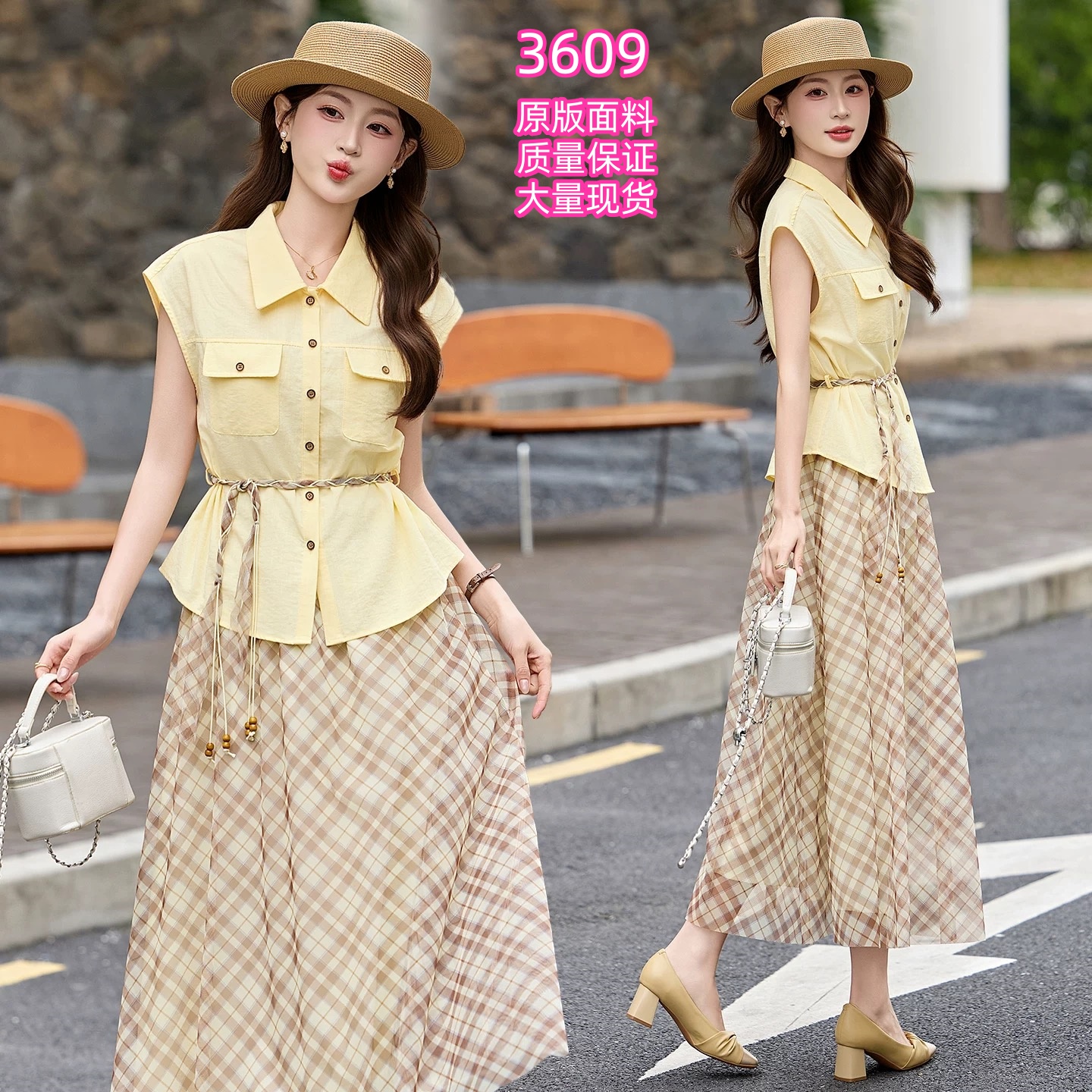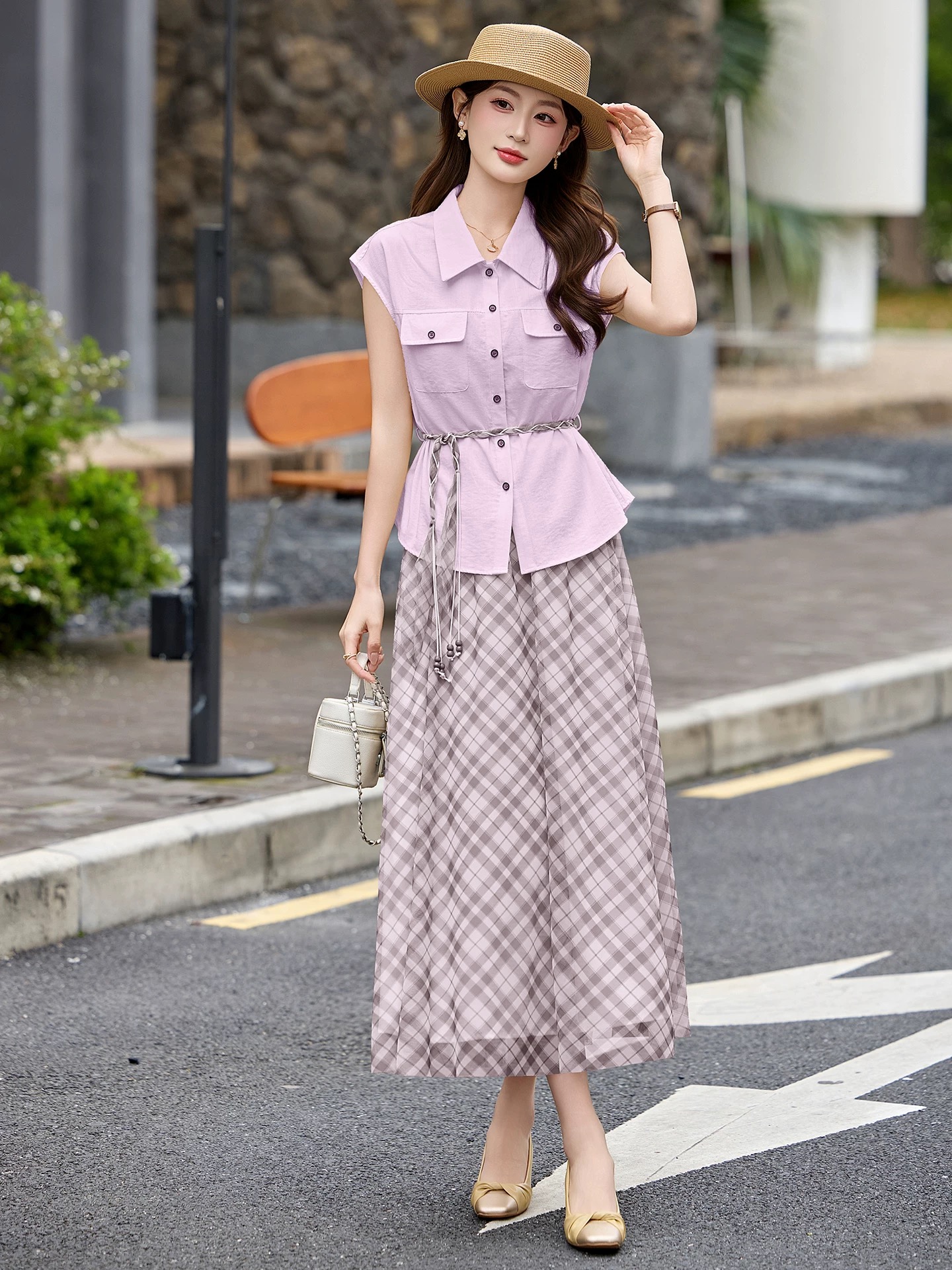 BY15367# 野餐名媛风收腰衬衫格纹半身裙女夏新款显瘦气质通勤两件套装服裝批發女裝批發服飾貨源