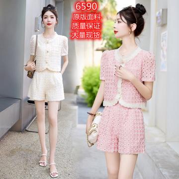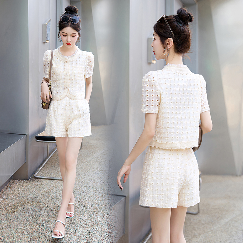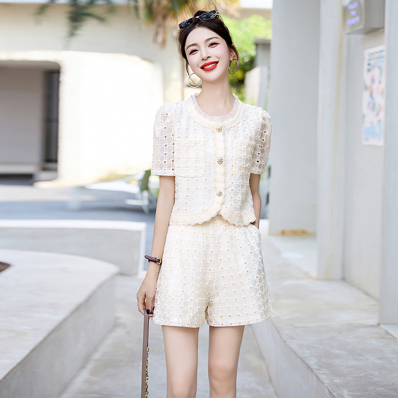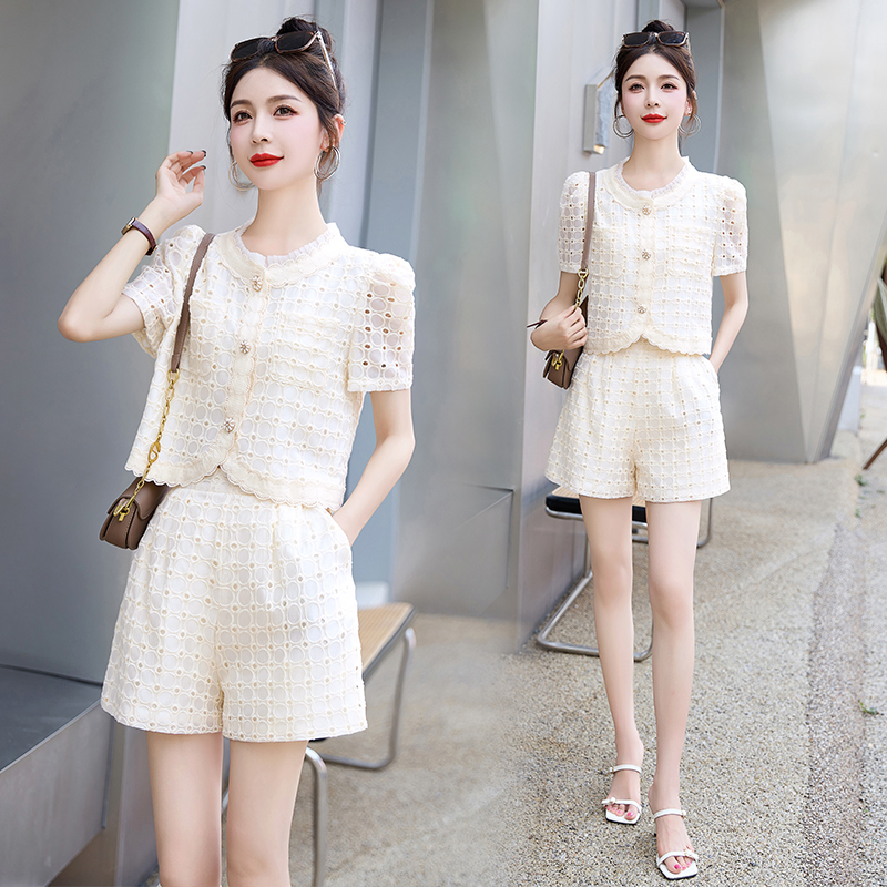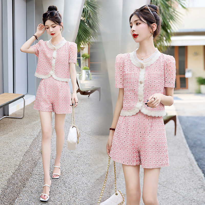 BY15372# 欧洲站夏季新款欧货时尚精品短袖镂空上衣+短裤两件小香套装服裝批發女裝批發服飾貨源