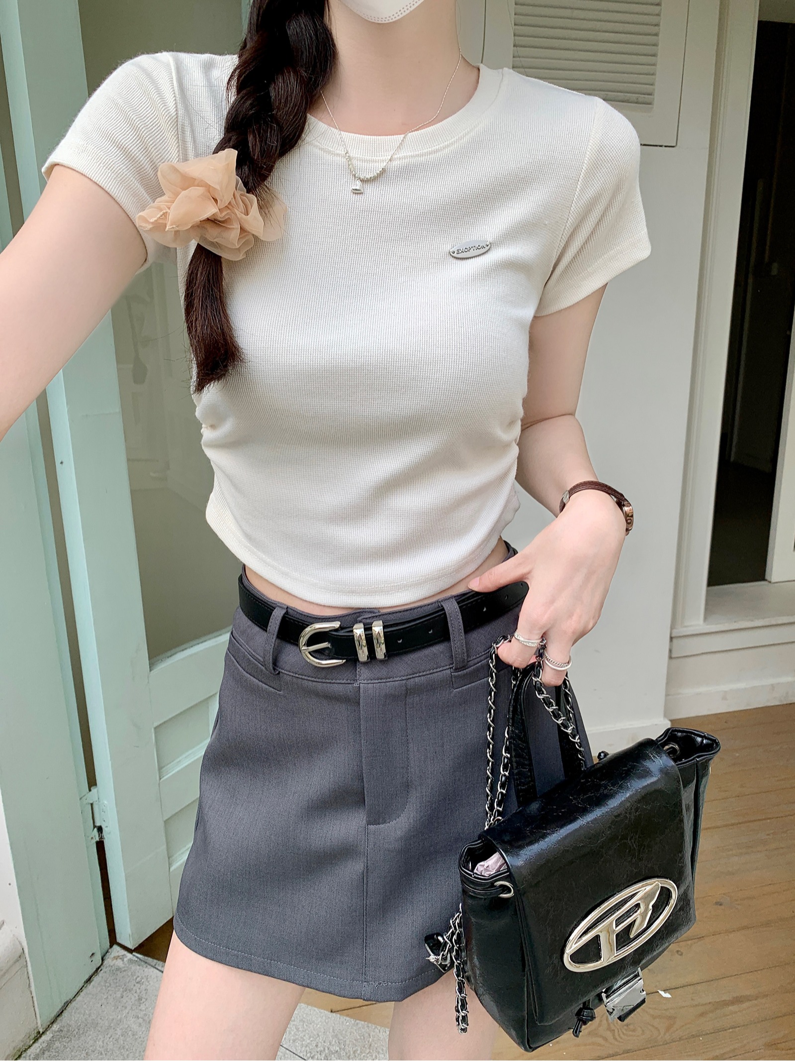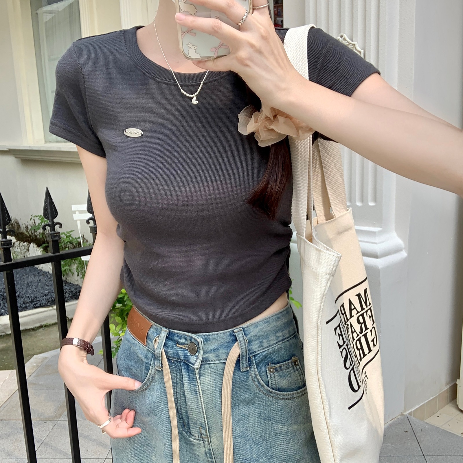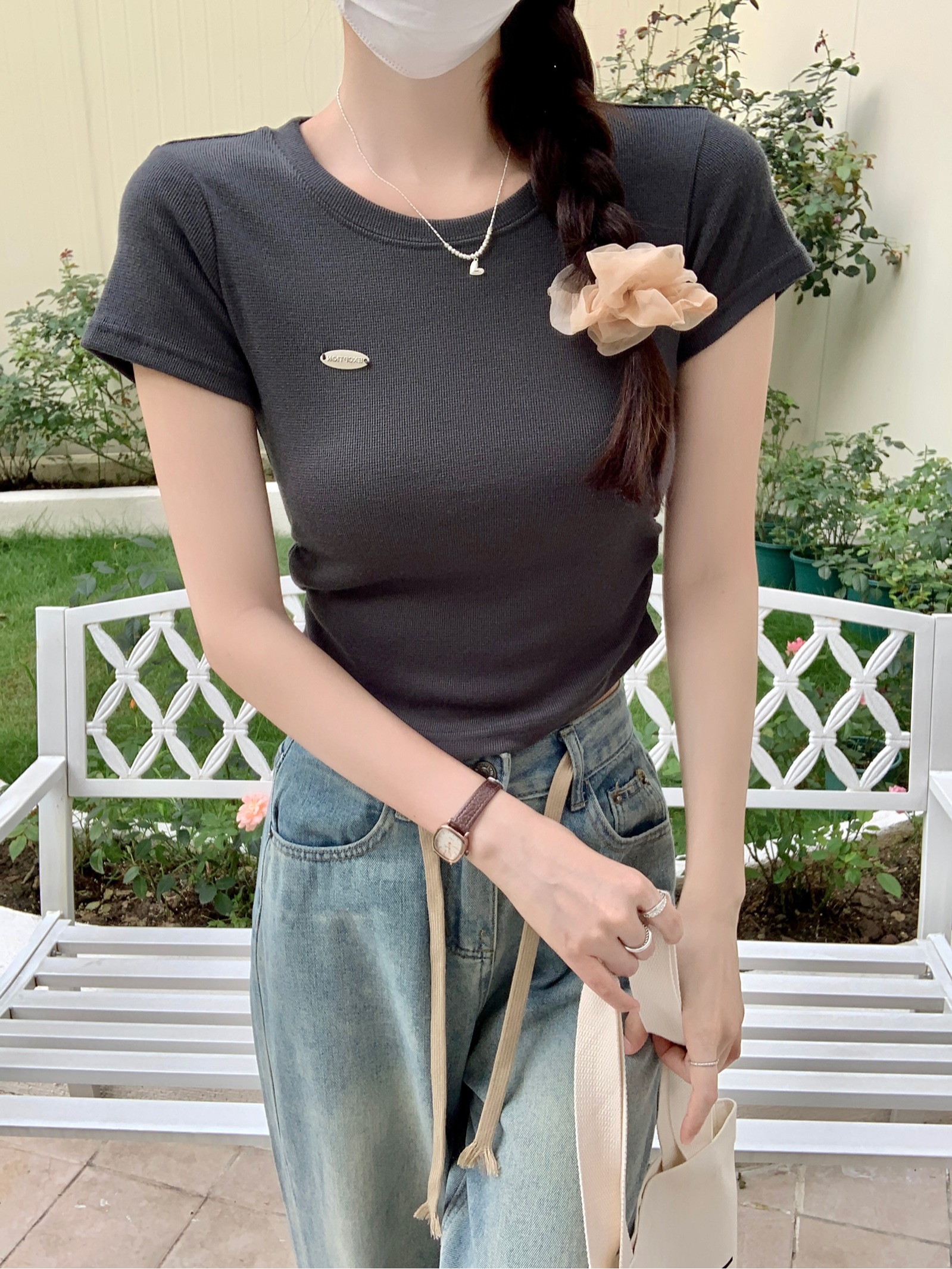 BY15379# 云梯棉短袖t恤夏短款刺绣纯色正肩修身圆领韩版女装上衣服裝批發女裝批發服飾貨源