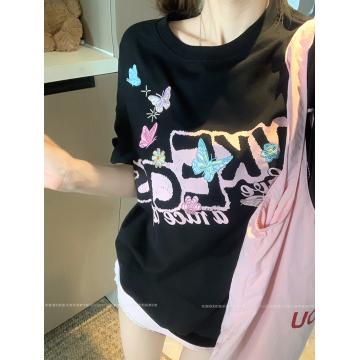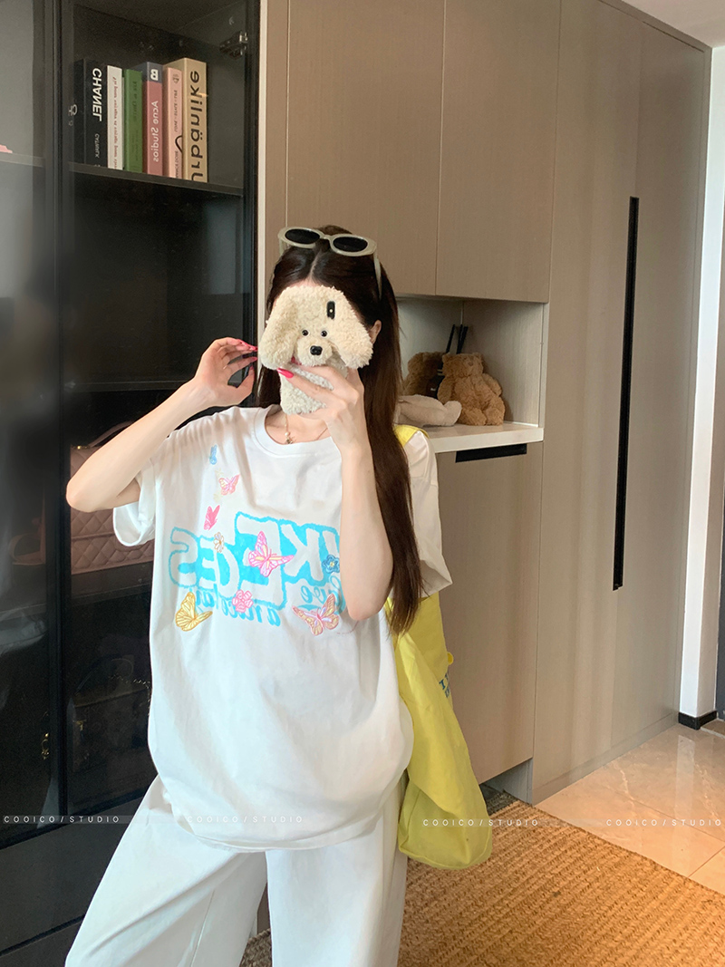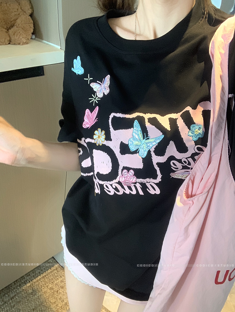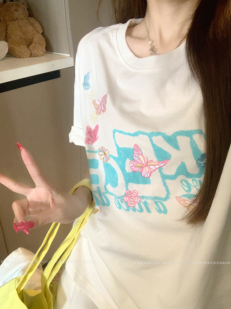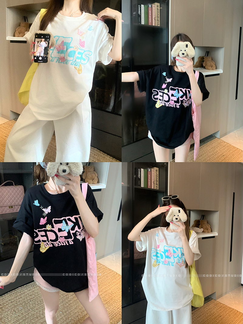 BY15380# 32支双纱纯棉短袖t恤男夏新款中长宽松刺绣圆领上衣女装服裝批發女裝批發服飾貨源