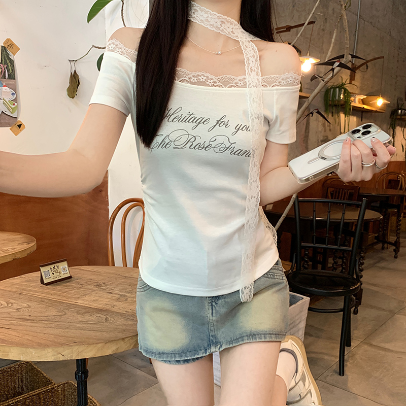 BY15383# 螺纹短袖t恤夏新款短款飘带露肩一字领上衣女装服裝批發女裝批發服飾貨源