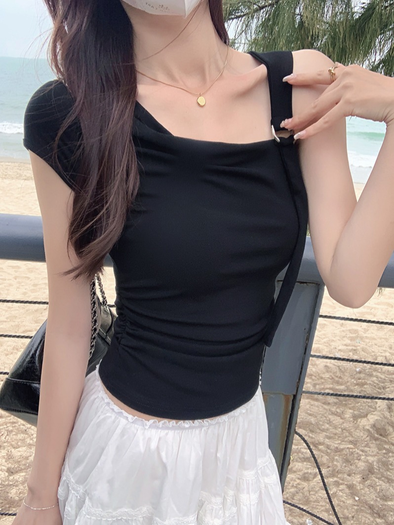 BY15389# 螺纹短袖t恤夏潮斜领露肩修身纯色韩版女装上衣服裝批發女裝批發服飾貨源
