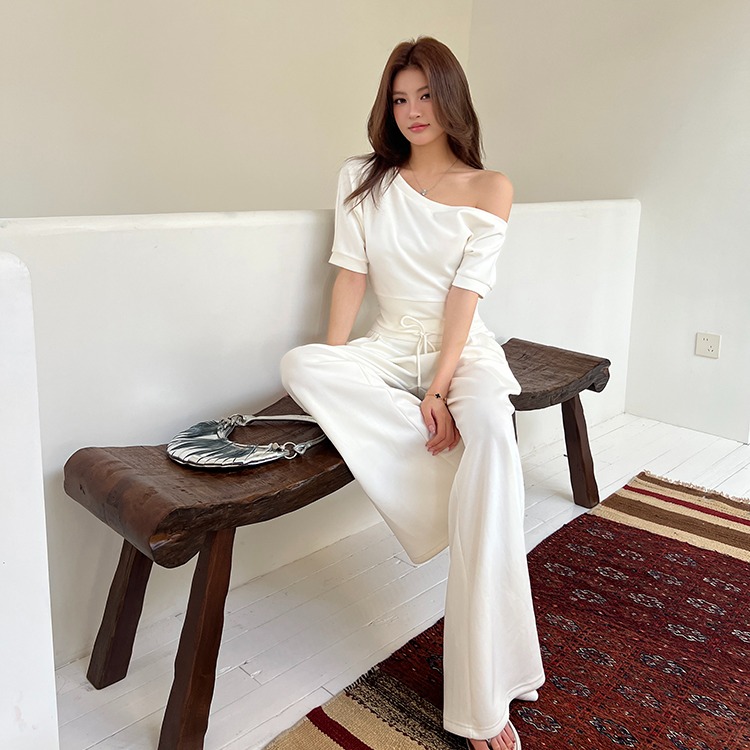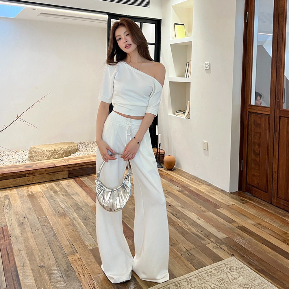BY15394# 春夏新款姐系魅力收腰斜肩上衣T宽松休闲阔腿裤两件套女服裝批發女裝批發服飾貨源