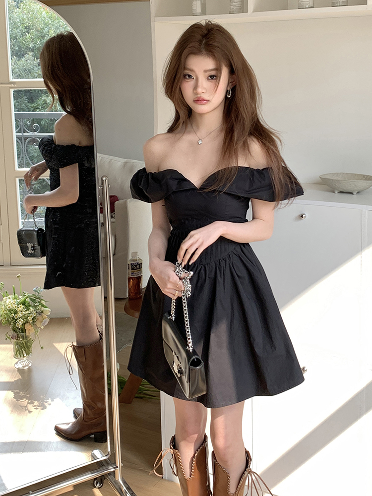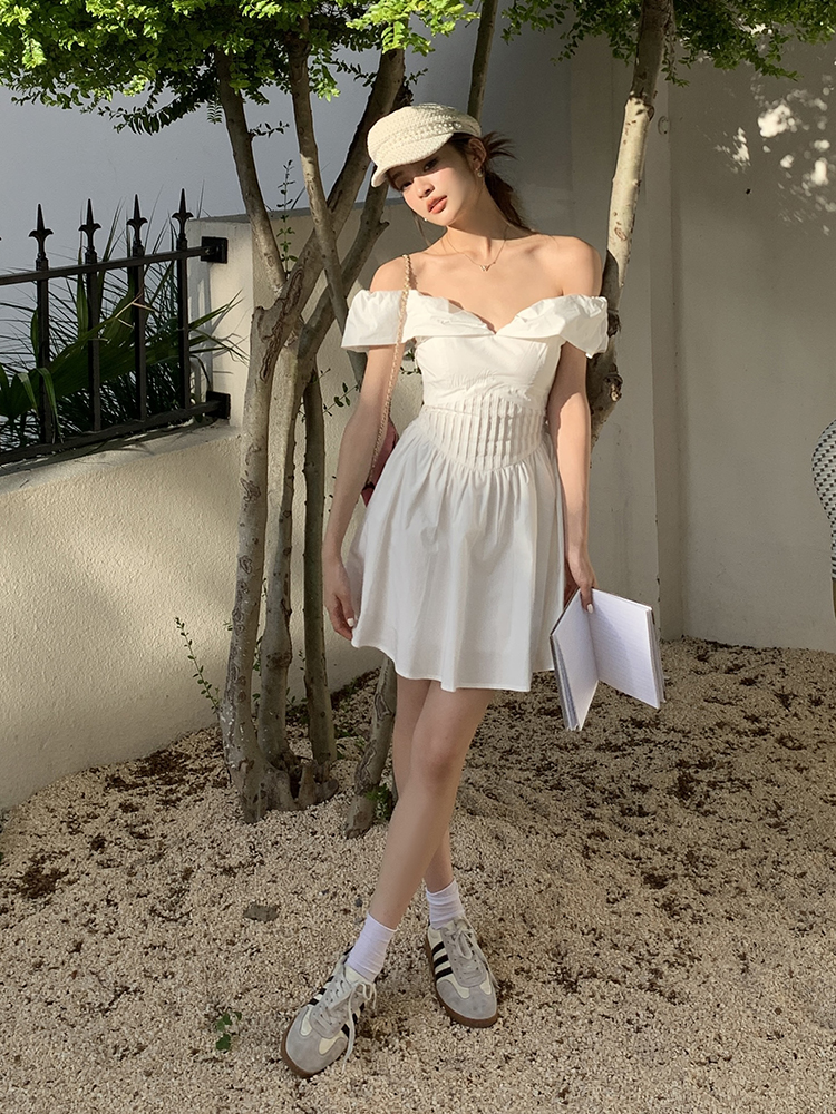 BY15403# 夏装新款设计感法式连衣裙女一字肩白气质初恋蓬蓬短裙子服裝批發女裝批發服飾貨源