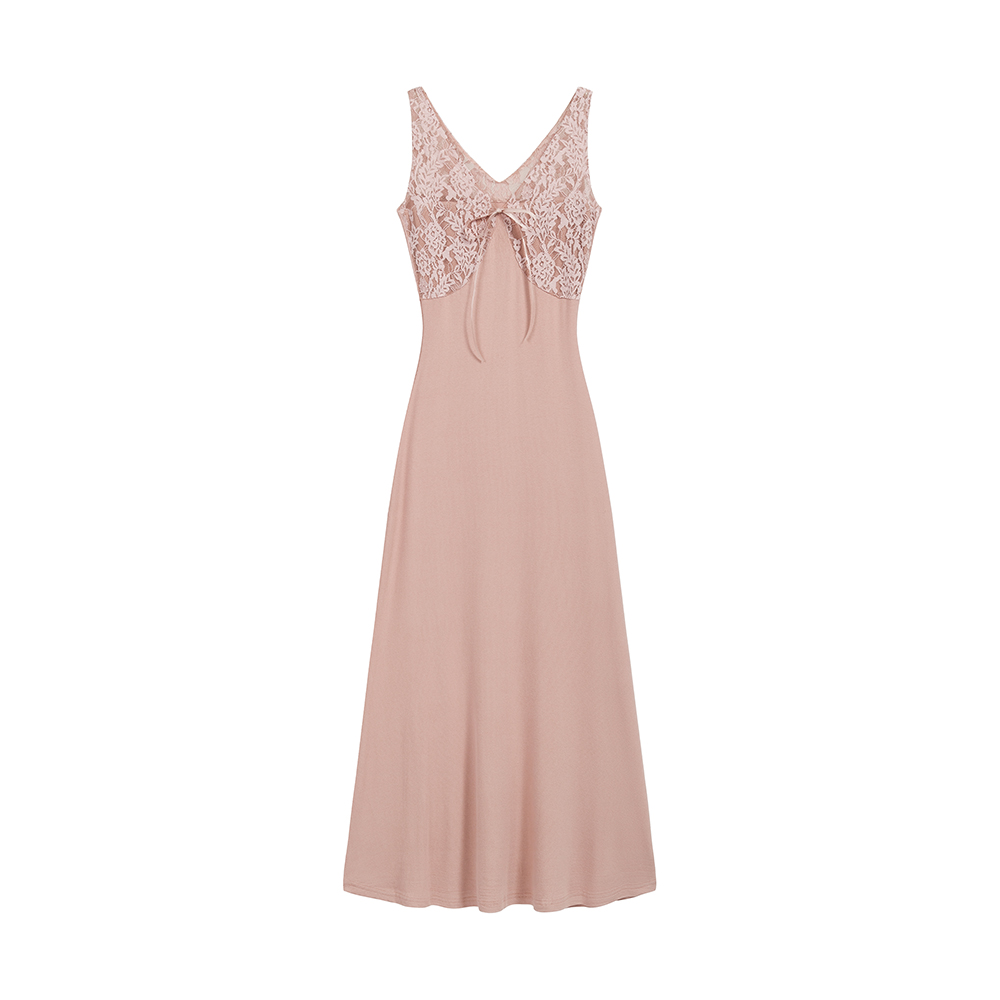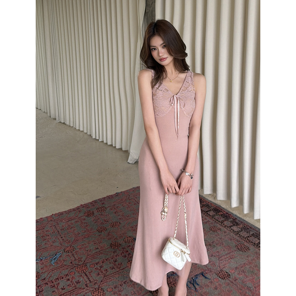 BY15406# 春夏新款粉色蕾丝拼接V领无袖连衣裙女修身气质优雅长裙服裝批發女裝批發服飾貨源