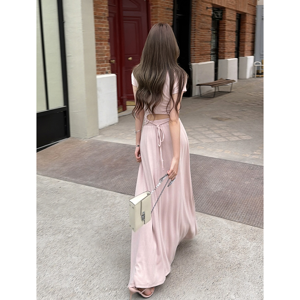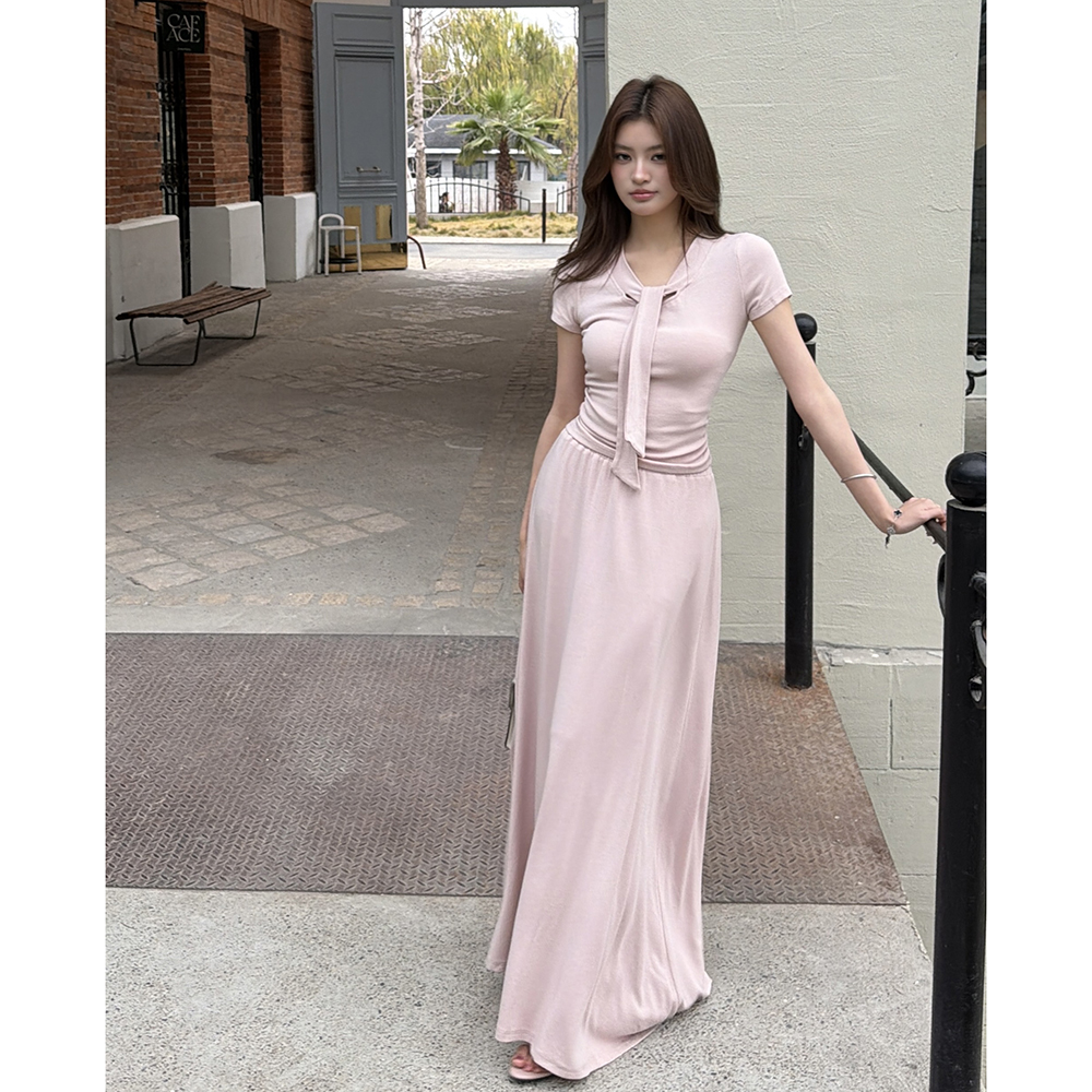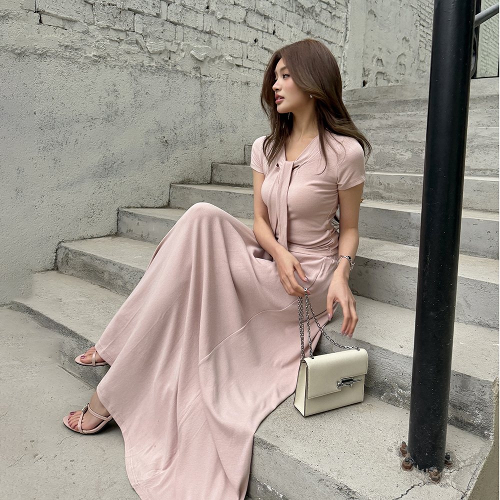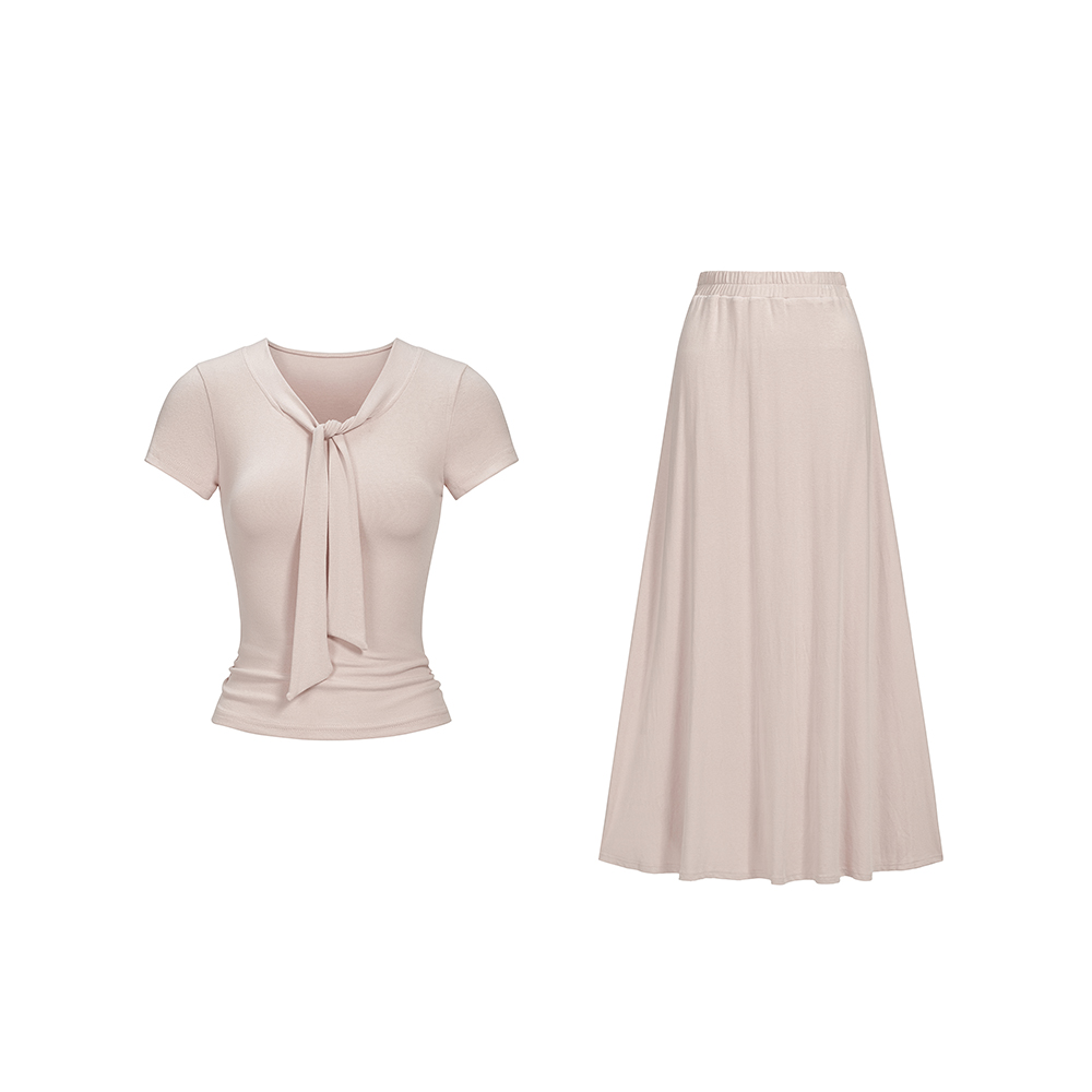 BY15407# 春夏新款气质慵懒松弛飘带T恤大摆半身裙长裙日常两件套服裝批發女裝批發服飾貨源