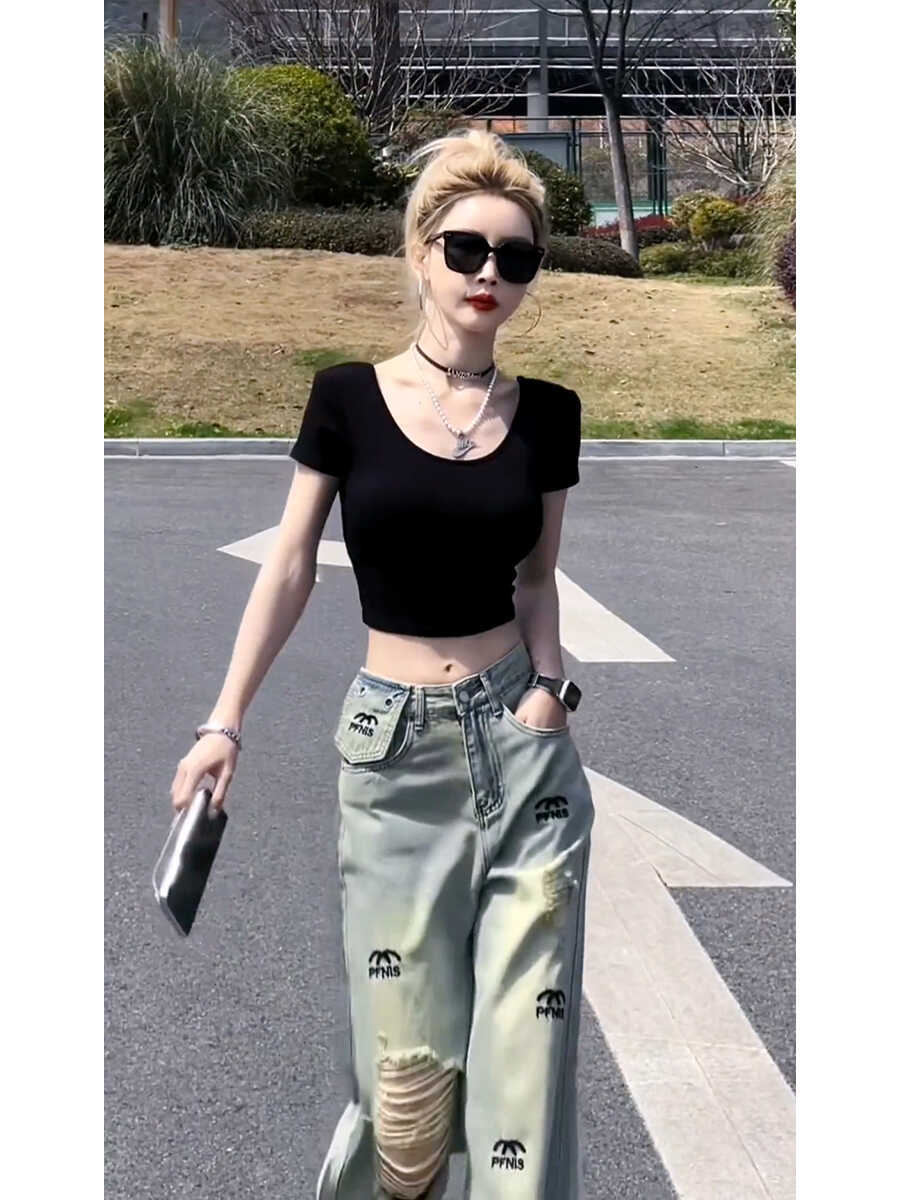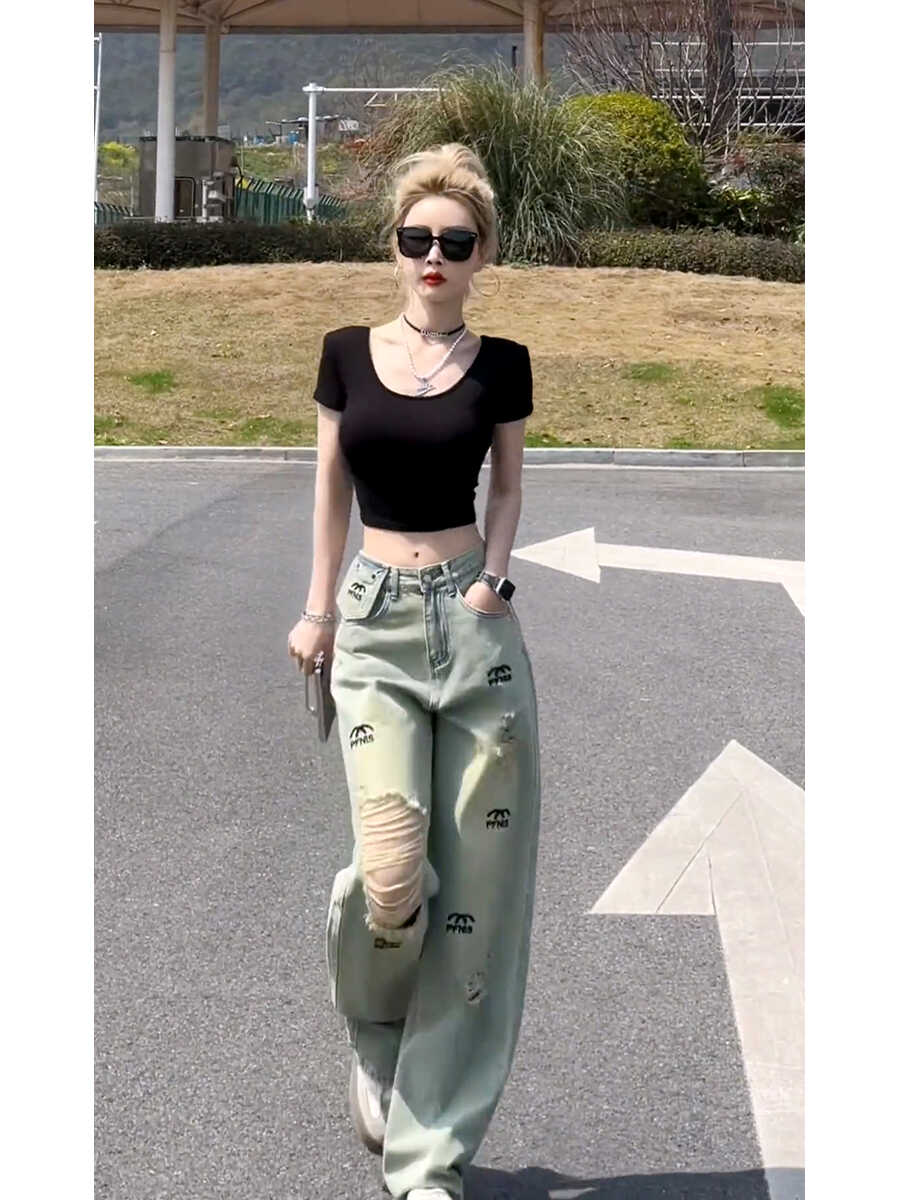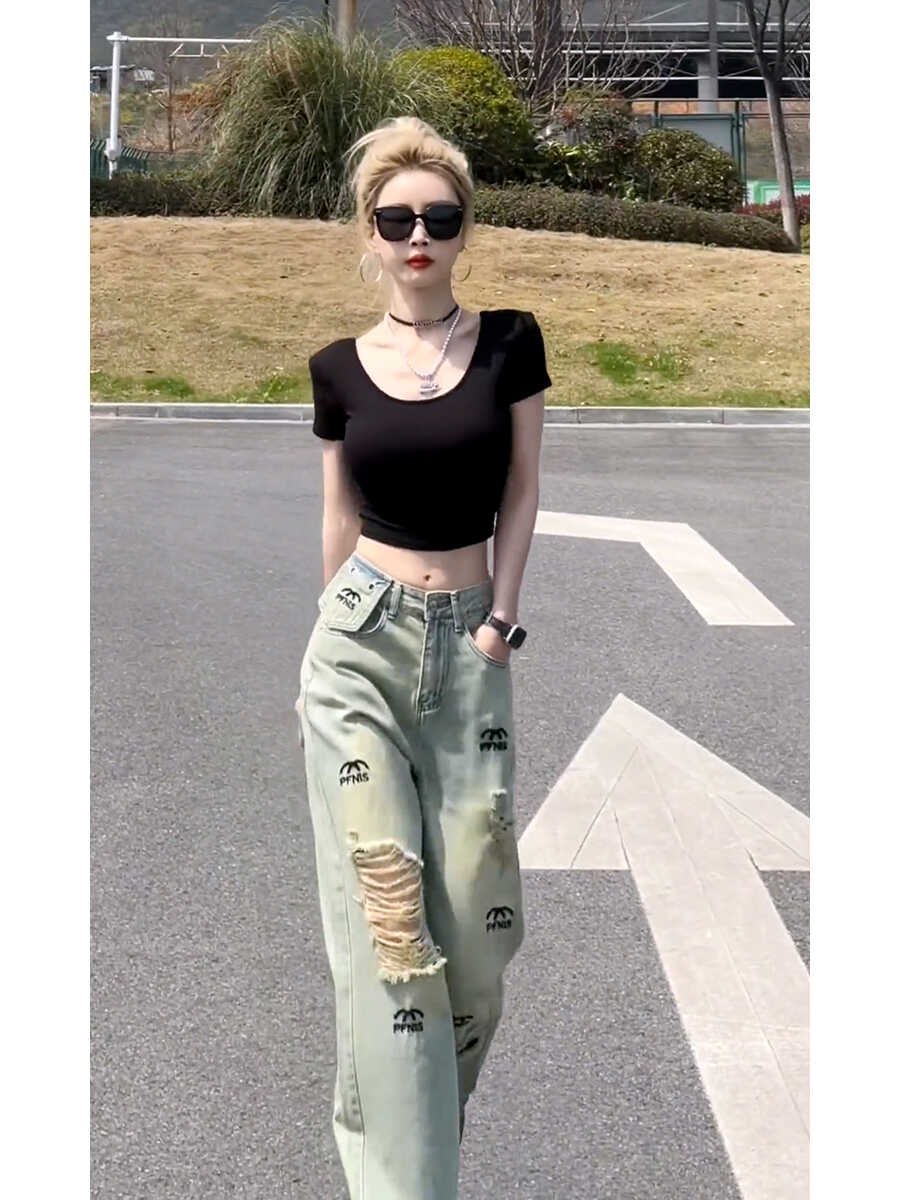 BY16536# 美式复古破洞牛仔裤女夏季新款高腰直筒显瘦小众设计感高街拖地裤 服裝批發女裝批發服飾貨源