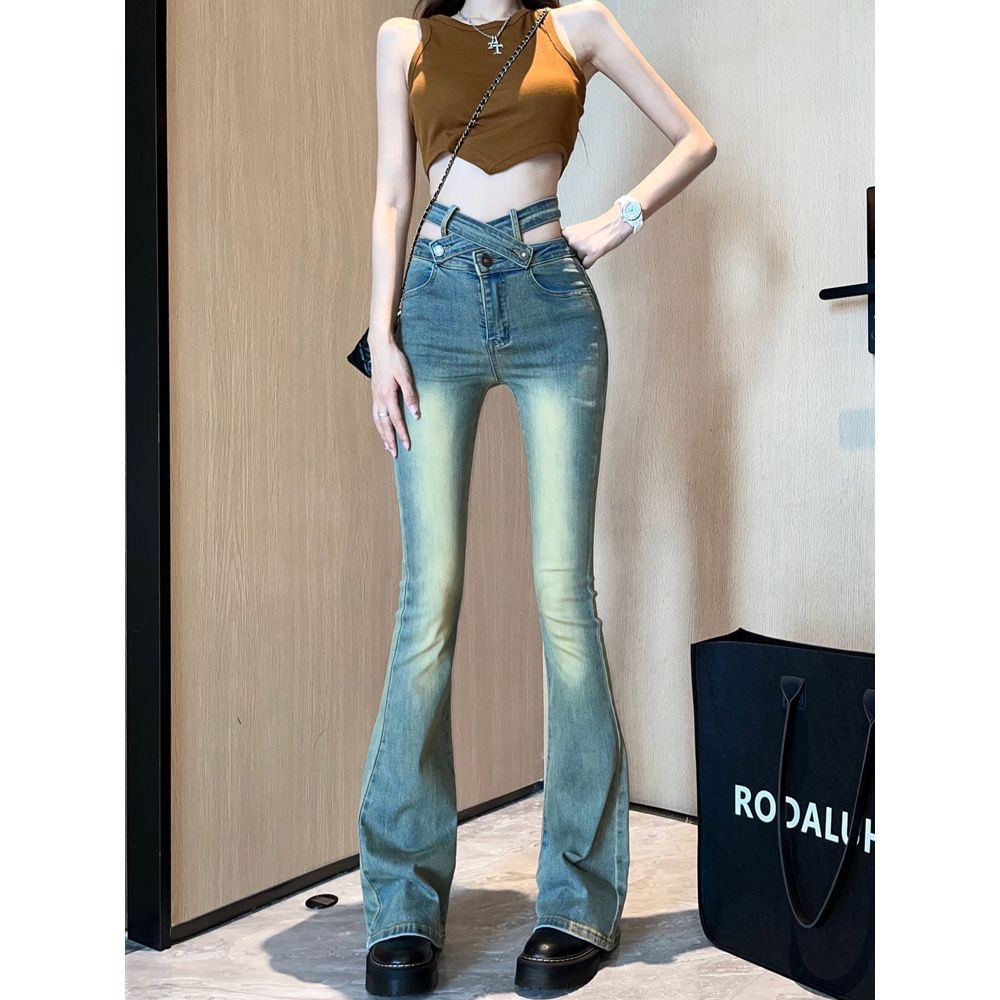 BY16537# 渐变色牛仔马蹄裤女春复古辣妹交叉镂空高腰裤弹力提臀微喇叭裤 服裝批發女裝批發服飾貨源