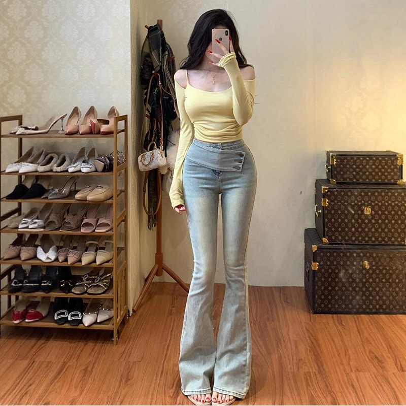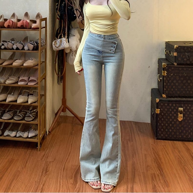 Home > 牛仔裤、长裤 > BY16539# 斜扣腰带设计微喇牛仔裤女韩漫腰臀比高腰显瘦长裤 服裝批發女裝批發服飾貨源