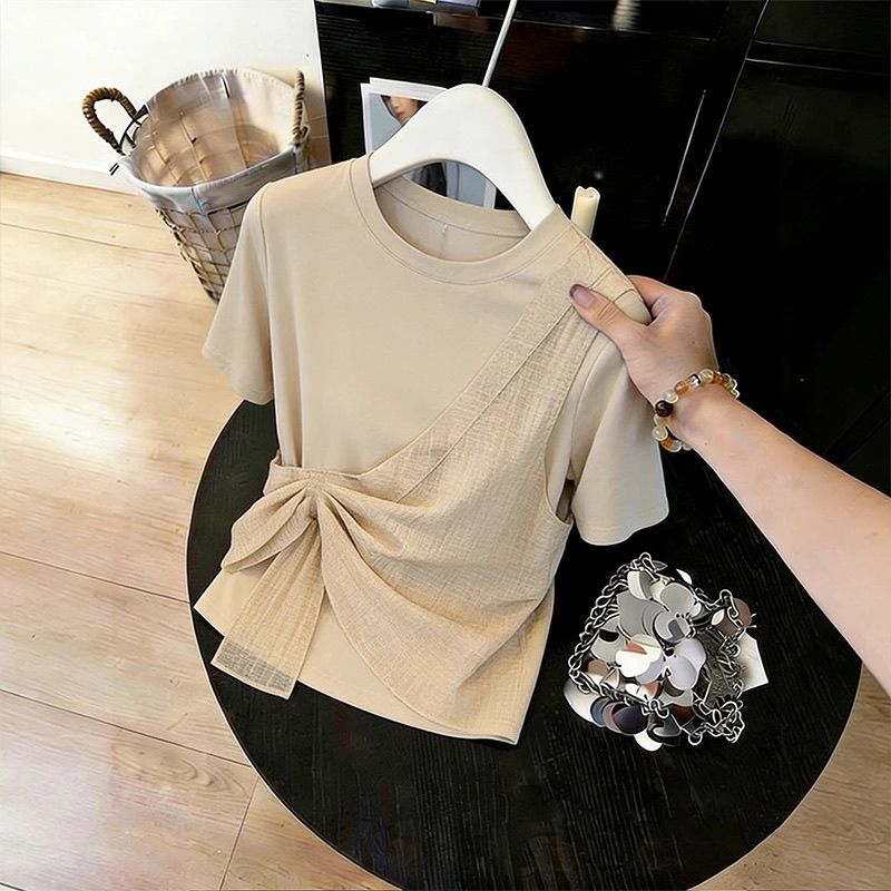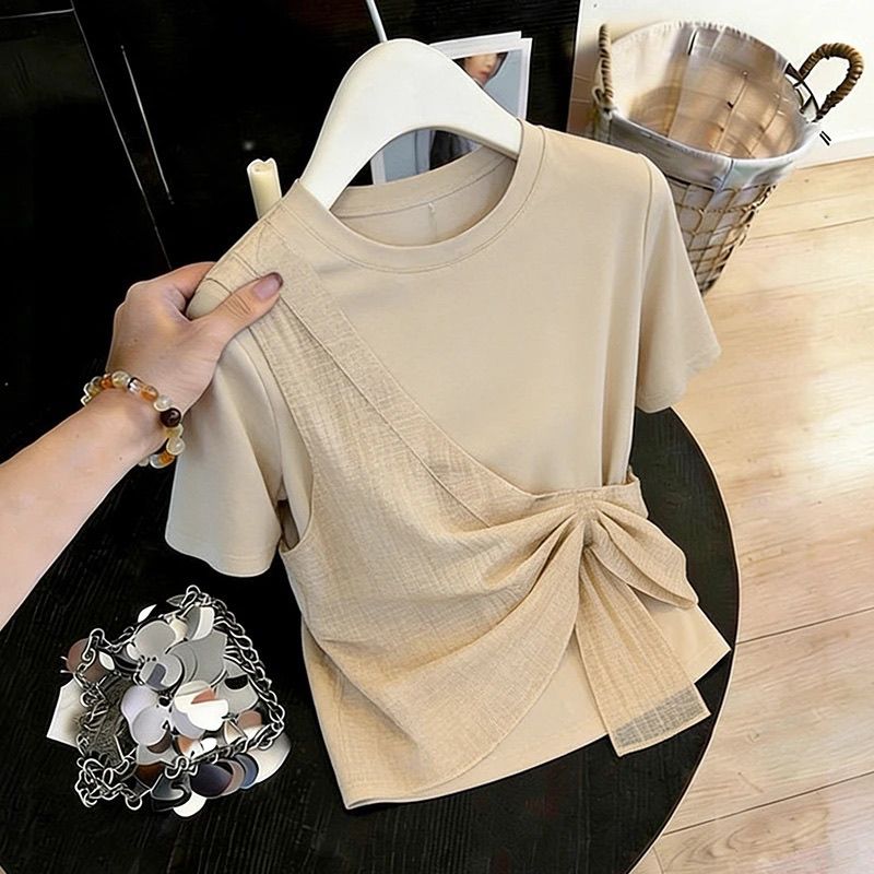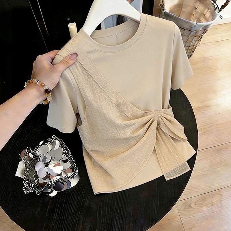 BY16576# 设计假两件拼接纱布短袖T恤夏季新款不规则微胖显瘦遮肉上衣 服裝批發女裝批發服飾貨源