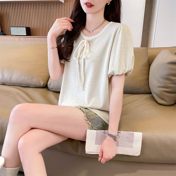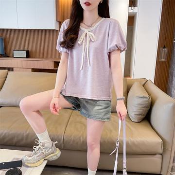Home > 短袖T恤 > BY16590# 短袖t恤女夏季新款韩版蝴蝶结花苞袖紫色百搭上衣女 服裝批發女裝批發服飾貨源