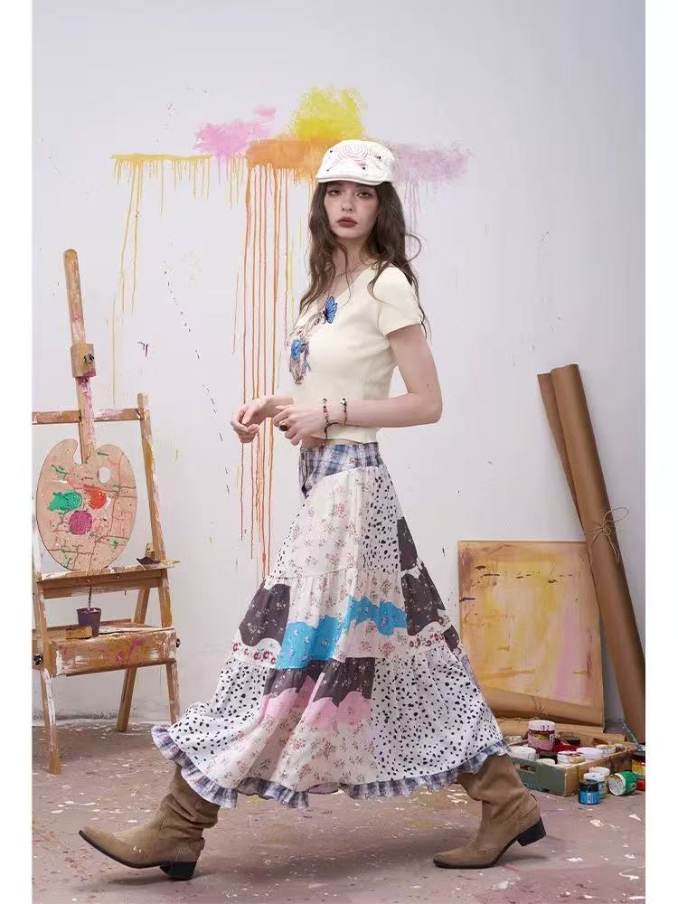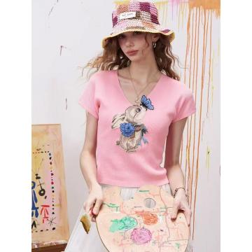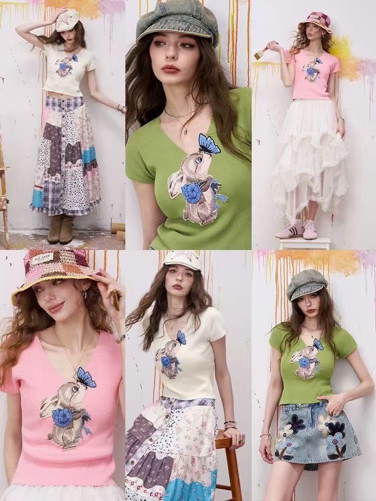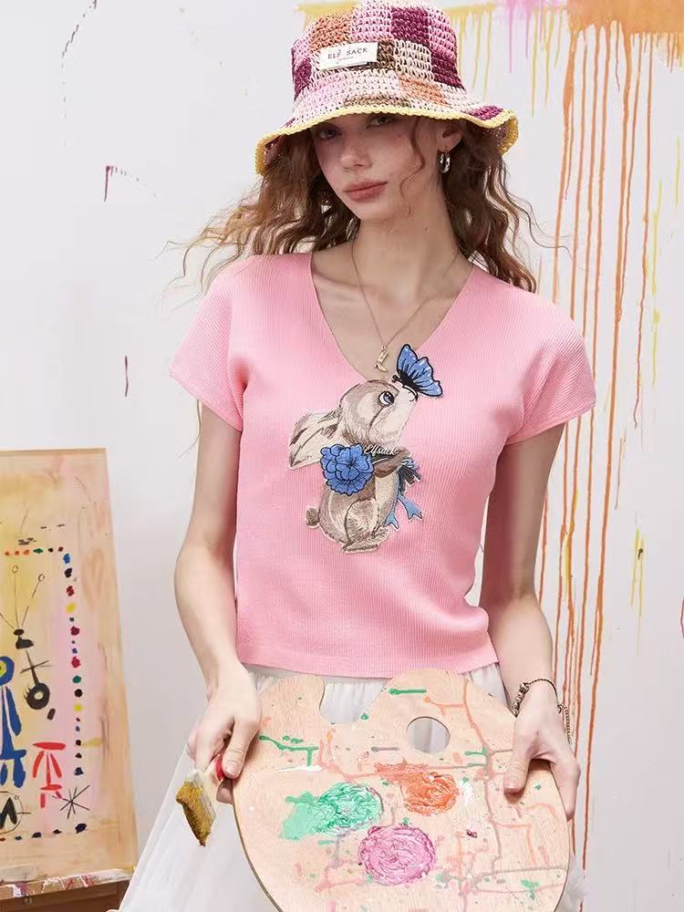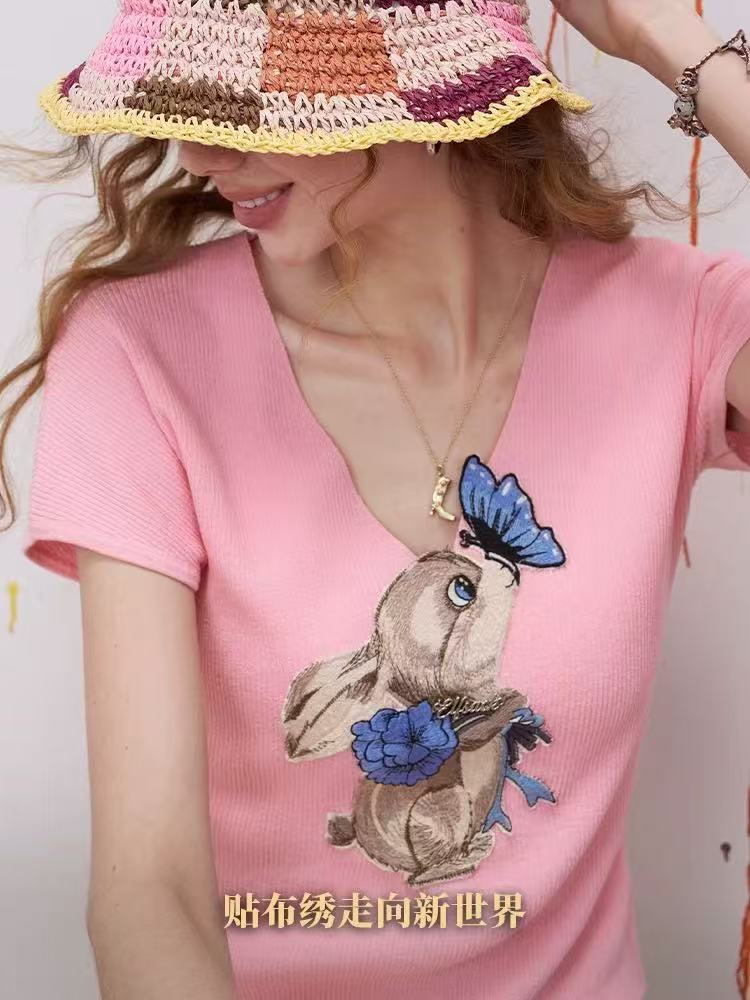 BY16613# 妖精的口袋时髦野心家贴布绣v领短袖针织衫女夏修身显瘦上衣 服裝批發女裝批發服飾貨源