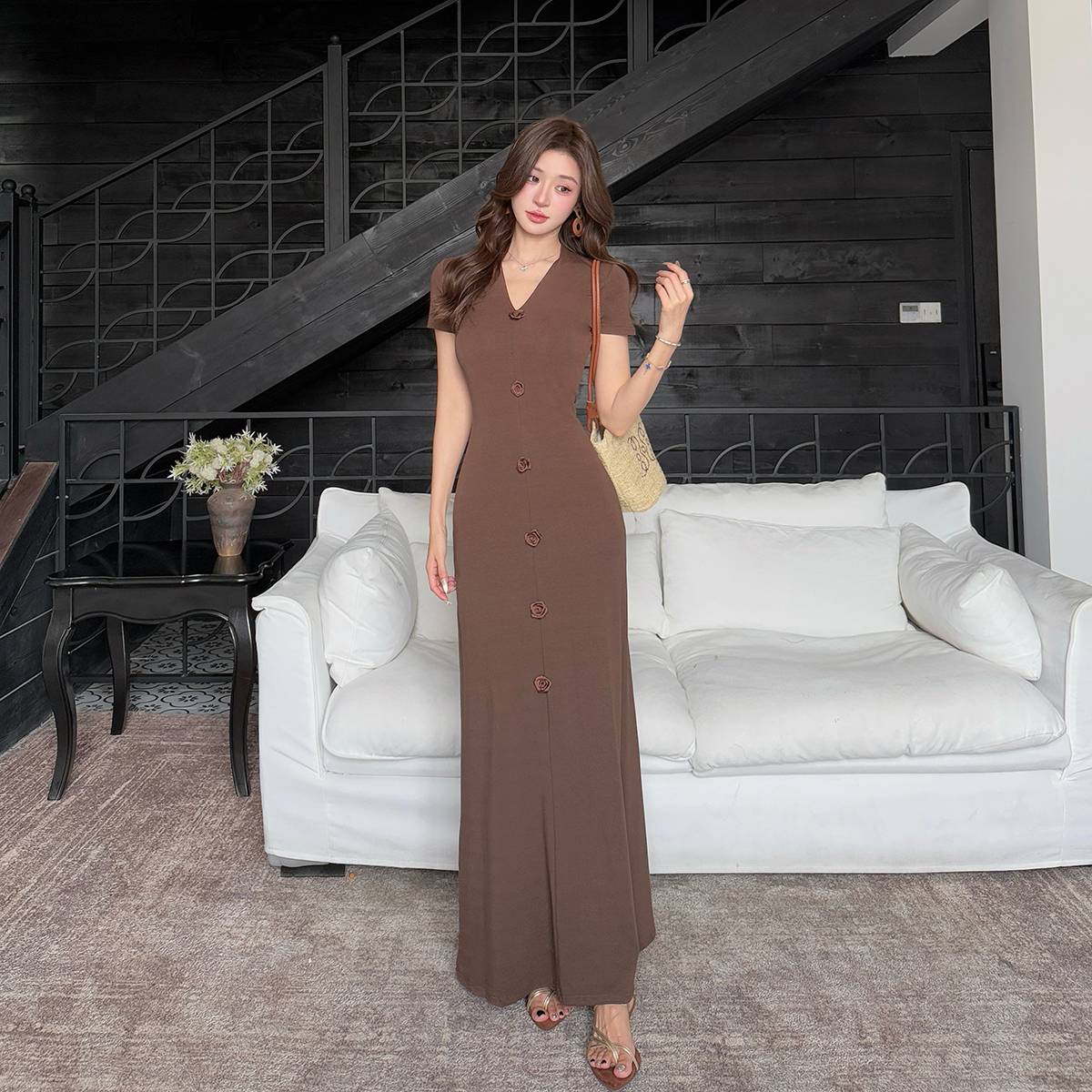 BY16631# 夏季新款气质连衣裙设计感小花时尚V领短袖长裙 服裝批發女裝批發服飾貨源