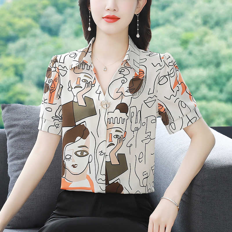 BY17377# 夏新款短袖真丝时尚气质印花POLO洋气上衣女小衫