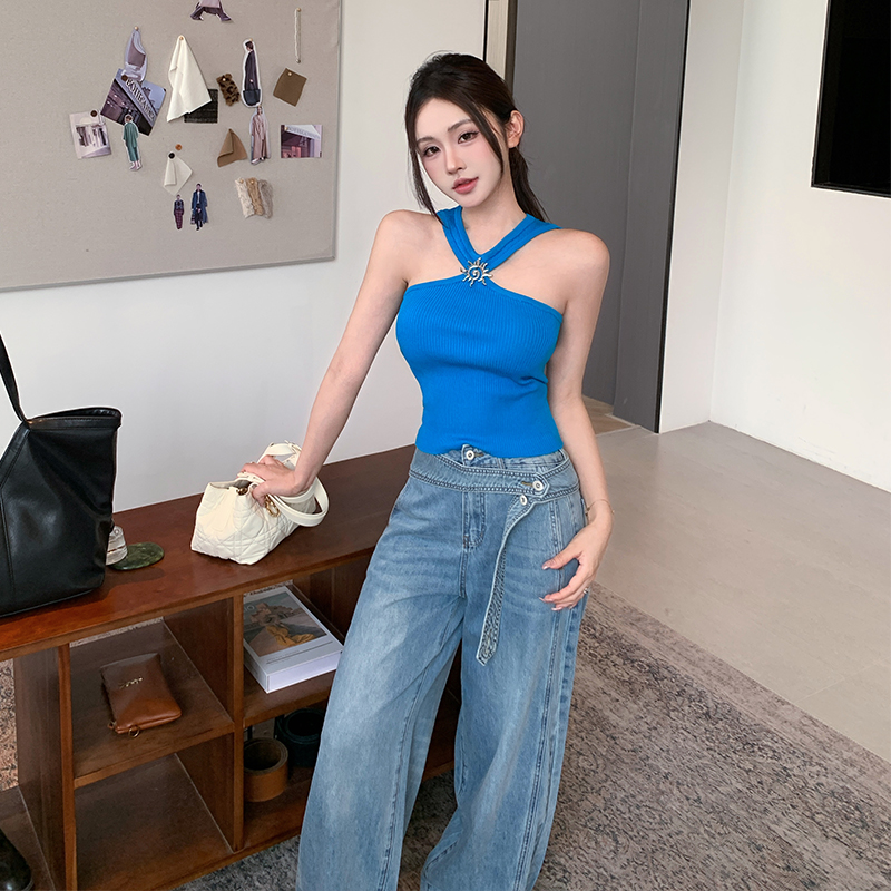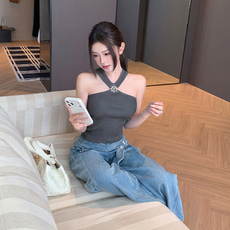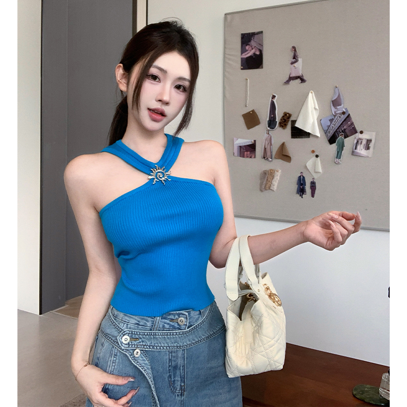 BY17421# 法式吊带背心女夏外穿美背性感短款无袖挂脖针织上衣酷飒