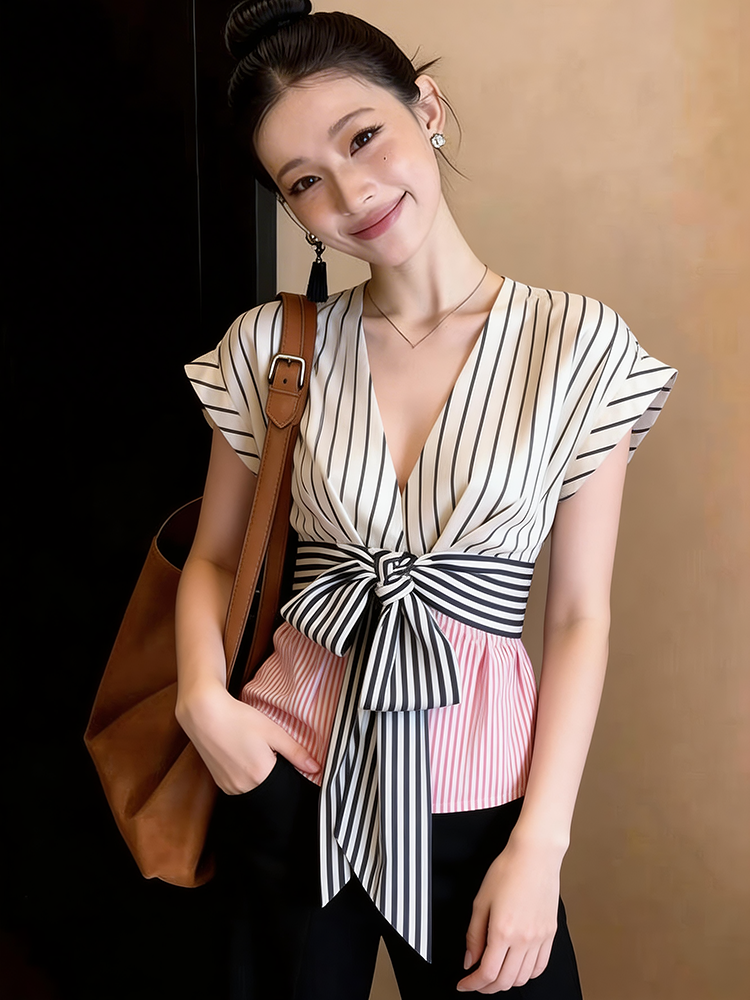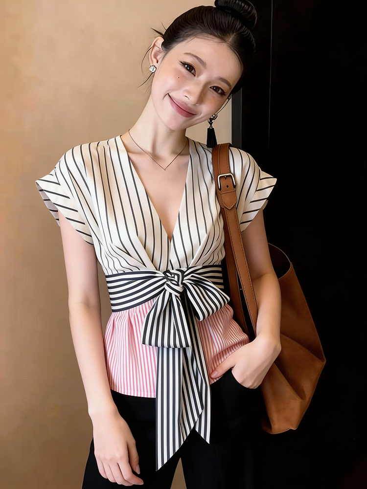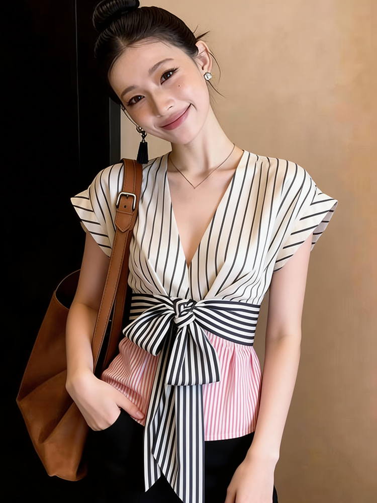 BY17426# 夏季复古辣妹小飞袖v领条纹衬衫女设计感小众蝴蝶结绑带收腰上衣