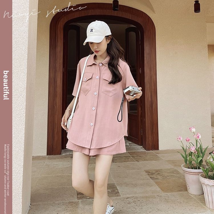 BY17603# 甜桃少女粉色短袖外套上衣斜纹短裤女夏季活泼减龄两件套 服裝批發女裝批發服飾貨源