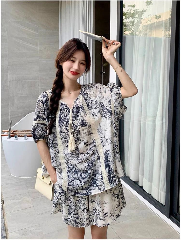 BY17605# 夏季新款水墨画旅游度假宽松短袖上衣两件套女 服裝批發女裝批發服飾貨源