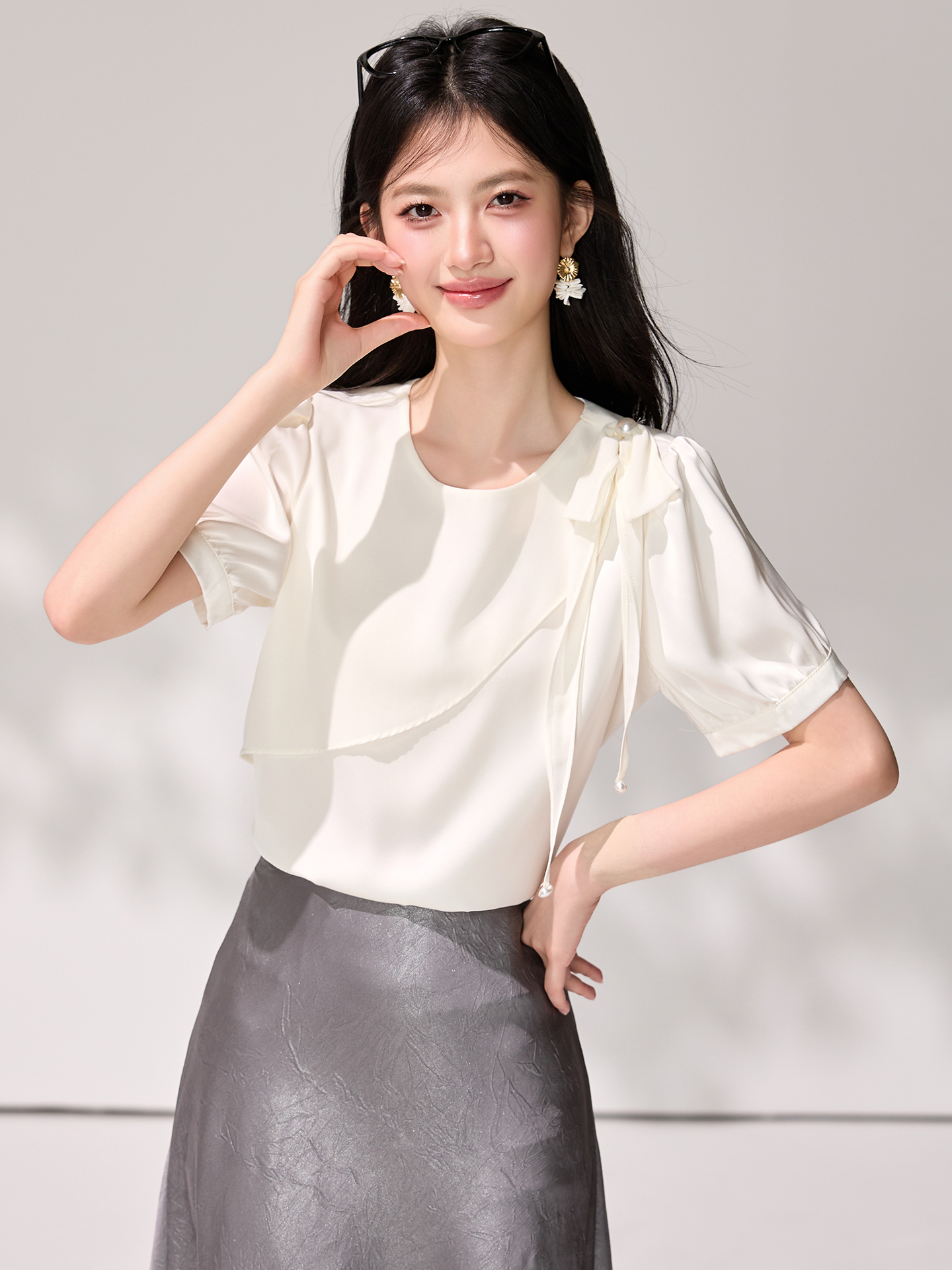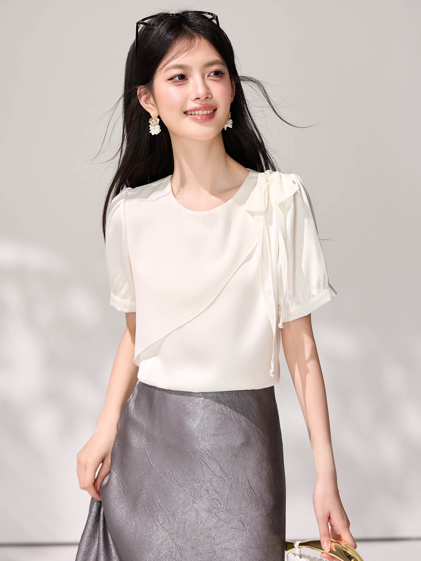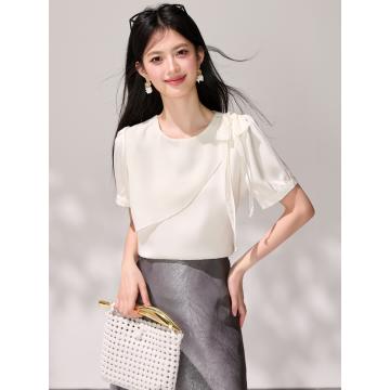 BY17612# 不规则荷叶边圆领短袖雪纺夏设计感钉珠蝴蝶结衬衫法式上衣 服裝批發女裝批發服飾貨源