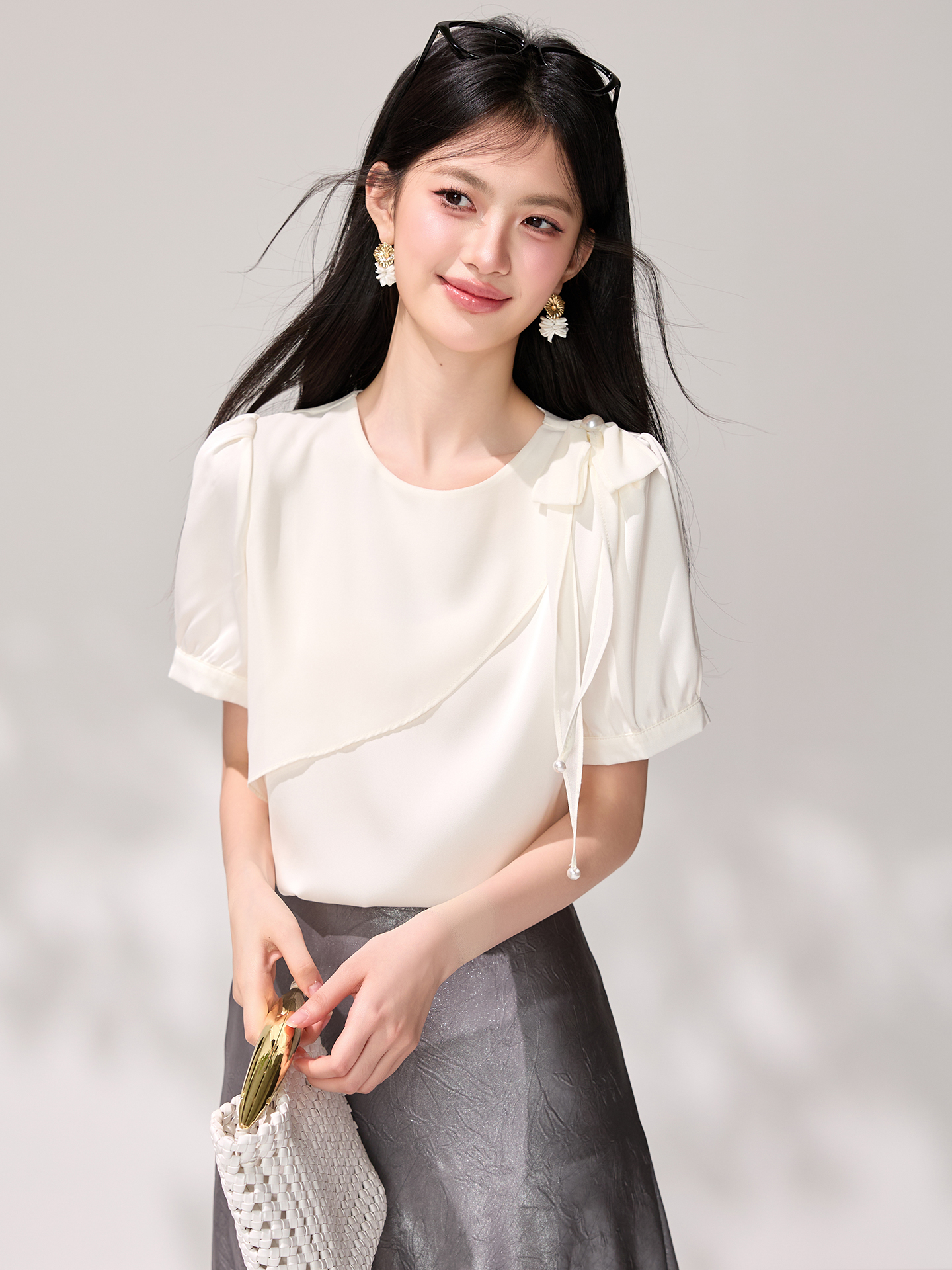 不规则荷叶边圆领短袖雪纺夏设计感钉珠蝴蝶结衬衫法式上衣 服裝批發女裝批發服飾貨源