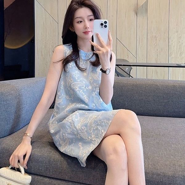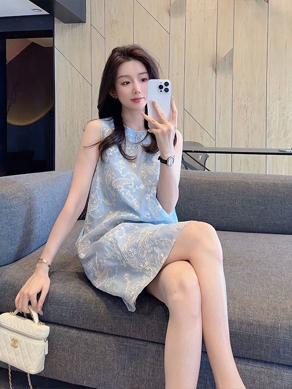 夏天新款流行爆款巨好看气质法式小香风蓝色无袖洋气小清新连衣裙 服裝批發女裝批發服飾貨源